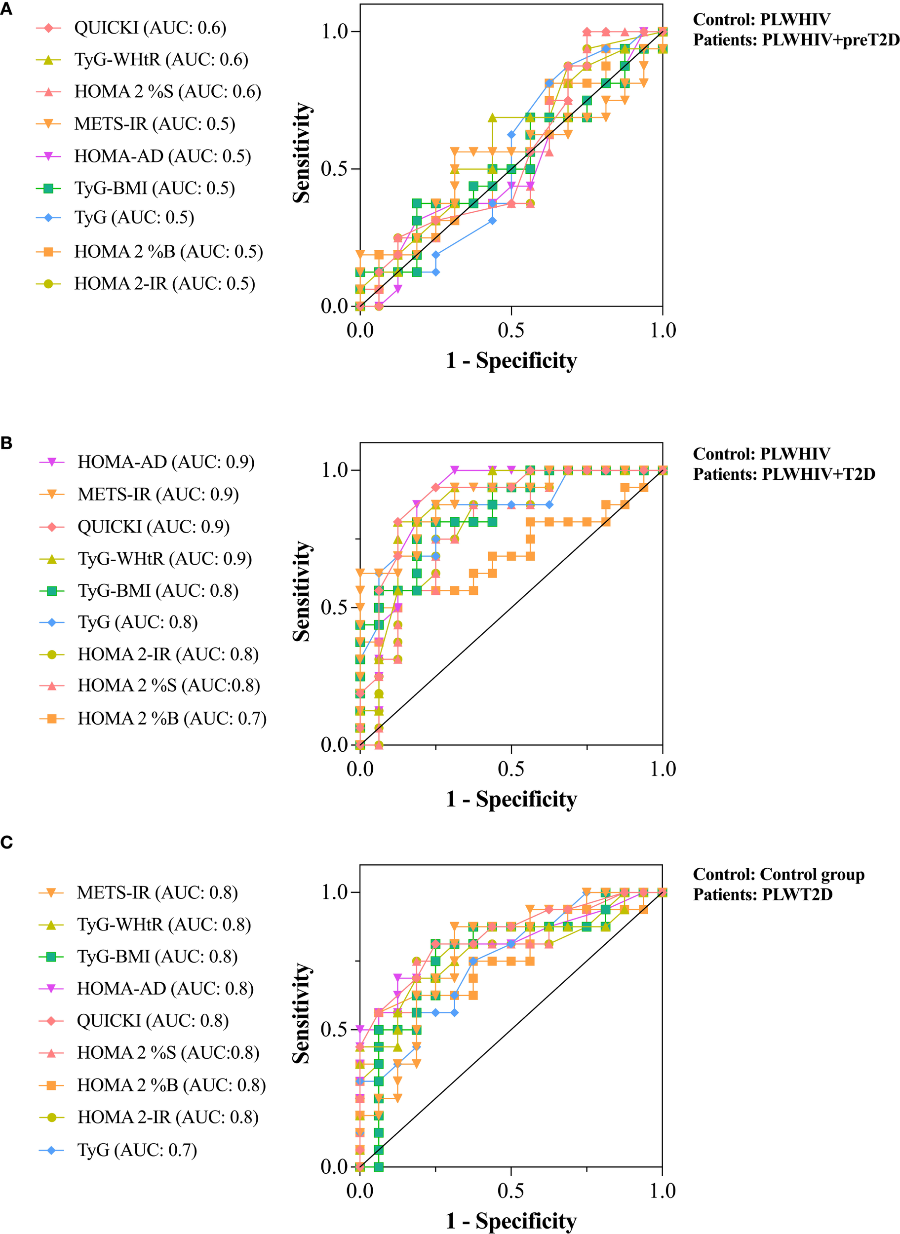 The discrimination of T2D in PLWHIV was effectively achieved by the indices HOMA-AD, TyG-WHtR, QUICKI, and METS-IR, with AUC values reaching up to 0.9. Moderate correlations were identified between HOMA-AD and METS-IR (R = 0.58), TyG-WHtR (R = 0.53), QUICKI (R = -0.90), DAI (R = 0.45), and VAI (R = 0.44), as well as inflammatory markers hs-CRP (R = 0.30), IL-6 (R = 0.25), and IL-18 (R = 0.27). A cutoff point of HOMA-AD >1 was associated with a significantly increased risk for T2D in PLWHIV (OR = 15.4; 95% CI: 2.79–79.5), x (OR = 1.97), and non-HIV T2D populations (OR = 9.53). These results highlight the importance of HOMA-AD and inflammatory markers in glycemic risk stratification.