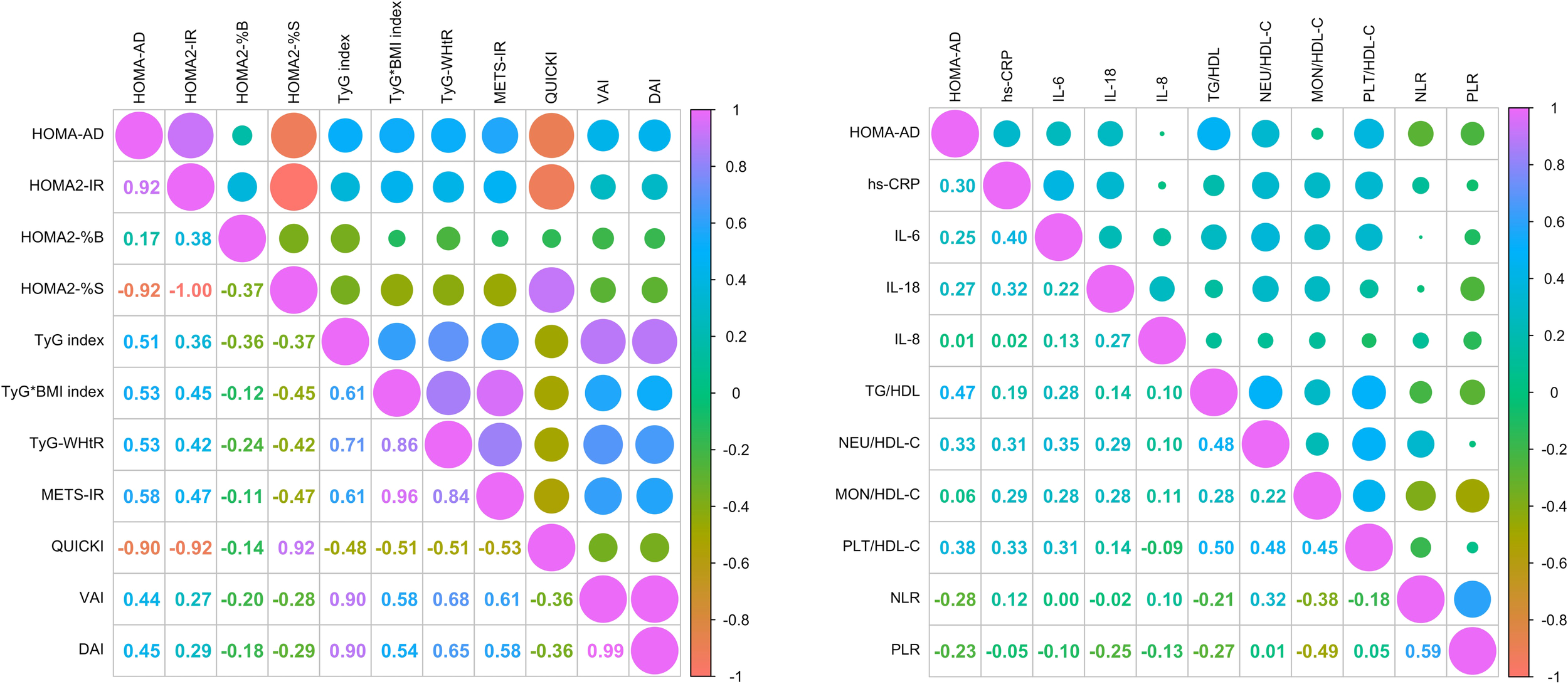 Inflammation and IR are closely linked in particular in context of obesity and T2D. Some indices are also useful for evaluating systemic inflammation. Ratios such as TG/HDL-C, NEU/HDL-C, MON/HDL-C, PLT/HDL-C, and the neutrophil-to-lymphocyte ratio (NLR) and platelet-to-lymphocyte ratio (PLR), are linked not only to metabolic disturbances but also to inflammatory biomarkers, including IL-6, IL-8, IL-18, and high-sensitivity C-reactive protein (hs-CRP) (16, 17). Their functionality positions these indices as accessible and clinically relevant tools that may enable an integrated evaluation of metabolic and inflammatory status, contributing to improved patient stratification and monitoring (18, 19).
