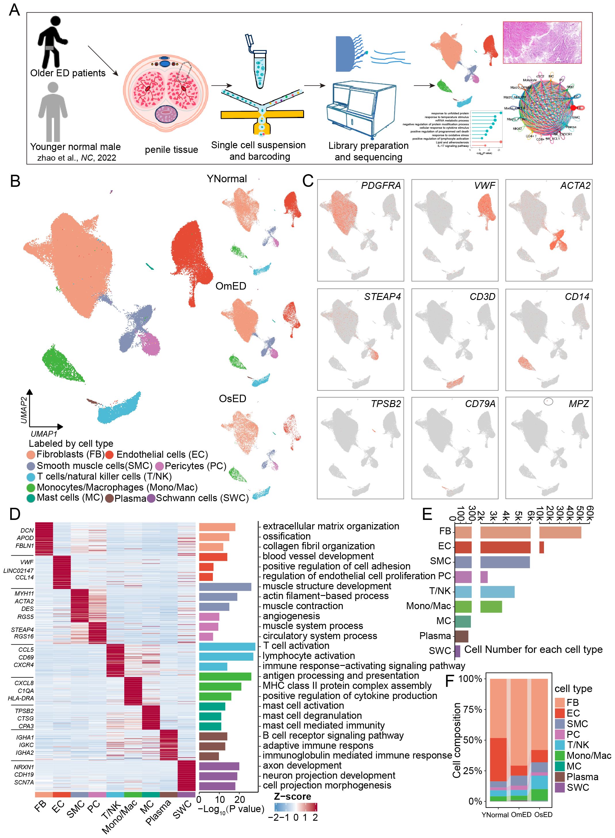 Figure 1. Global single-cell landscape for human CC in aging-related ED. (A) Schematic graph describing the experimental workflow. Human penile tissues from six older patients with erectile dysfunction were collected for single-cell RNA-seq. (B) Uniform manifold approximation and projection (UMAP) plots showing 83,743 cells from nine individuals (three younger normal males from GSE206528, four older mild ED patients and two older severe ED patients) separated into nine major cell types (left) and cell type distribution in YNormal, OmED and OsED groups (right). (C) Feature plots showing the expression distribution of marker genes for each cell type: PDGFRA (FB), VWF (EC), ACTA2 (SMC), STEAP4 (PC), CD3D (T/NK), CD14 (Mono/Mac), TPSB2 (MC), CD79A (Plasma) and MPZ (SWC). (D) Heatmap showing row z-score expression signatures of top 100 cell type specific genes. Top three marker genes for each cell type are shown on the left of heatmap (left). Enriched representative Gene Ontology (GO) terms for marker genes (right). (E) Bar plots showing the numbers of each cell type in human penile tissues. (F) Cell proportion of each cell type in different groups.