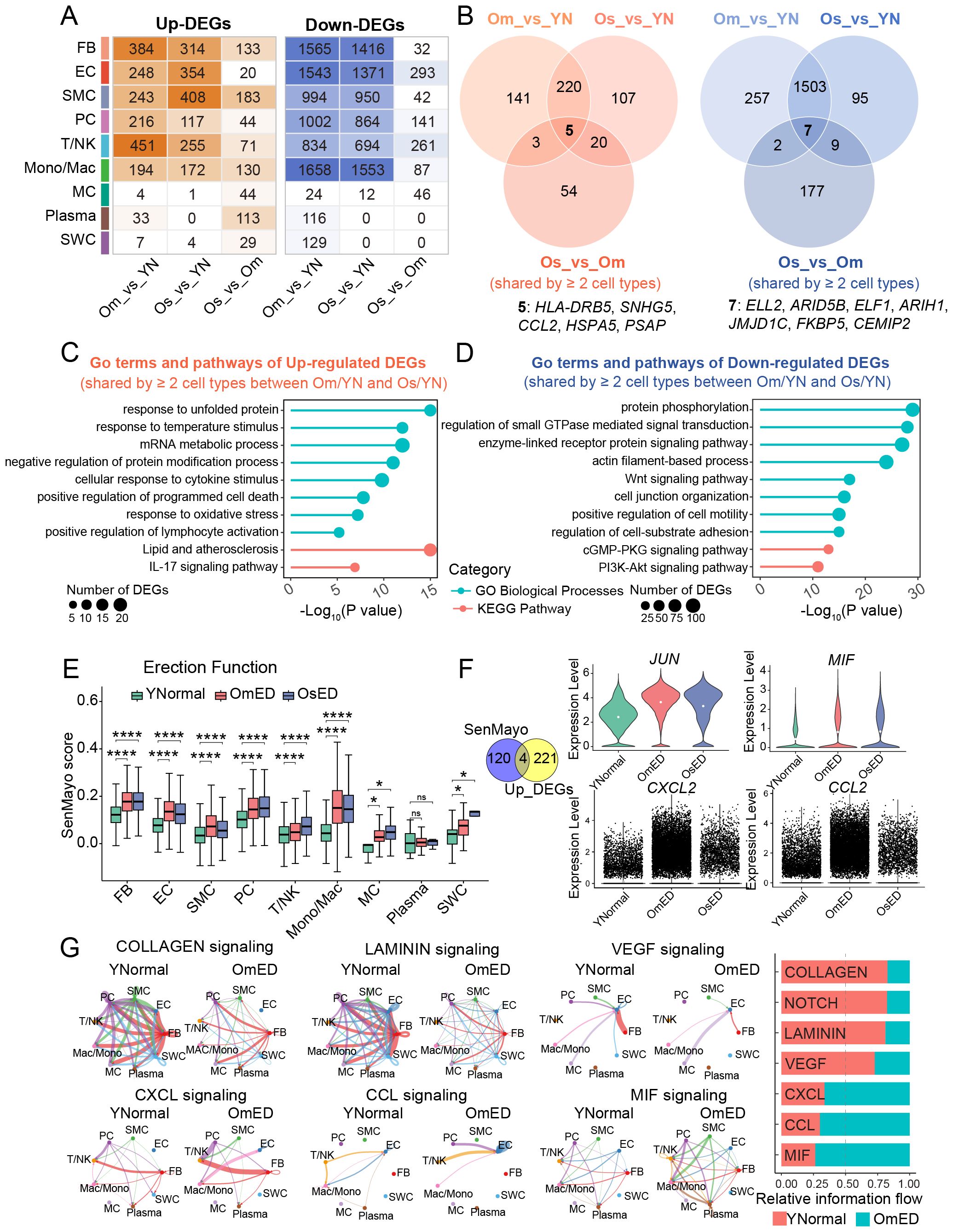 Figure 2. Changes in the transcriptional characteristics and cell-cell communications in ARED. (A) Heatmap showing the number of upregulated (left) and downregulated (right) DEGs per cell type derived from pairwise comparisons between groups. (B) Venn diagrams showing the overlaps of upregulated (left) and downregulated (right) DEGs (shared by ≥ 2 cell types) across three different group comparisons. Common upregulated (left) and downregulated (right) DEGs in pairwise comparisons are listed below. (C, D) Representative GO terms and pathways of common DEGs that are upregulated (C) and downregulated (D) in at least two cell types in both OmED and OsED compared with YNormal. (E) Box plot showing the SenMayo gene set score in different groups across different cell types ns, not significant; *, p.adj < 0.05; ****, p.adj < 0.0001. (F) Left, Venn diagram showing an overlap between SenMayo gene set and common upregulated DEGs. Right, Violin plots showing the expression levels of overlap genes in different groups. The white solid circle represents the mean value. (G) Circle plots showing the differential signaling pathways in intercellular communication network between YNormal and OmED (left). Stacked bar chart showing the overall information flow of these signaling pathways (right). Signal pathways colored red represent decreased in OmED and pathways colored green represent increased in OmED.