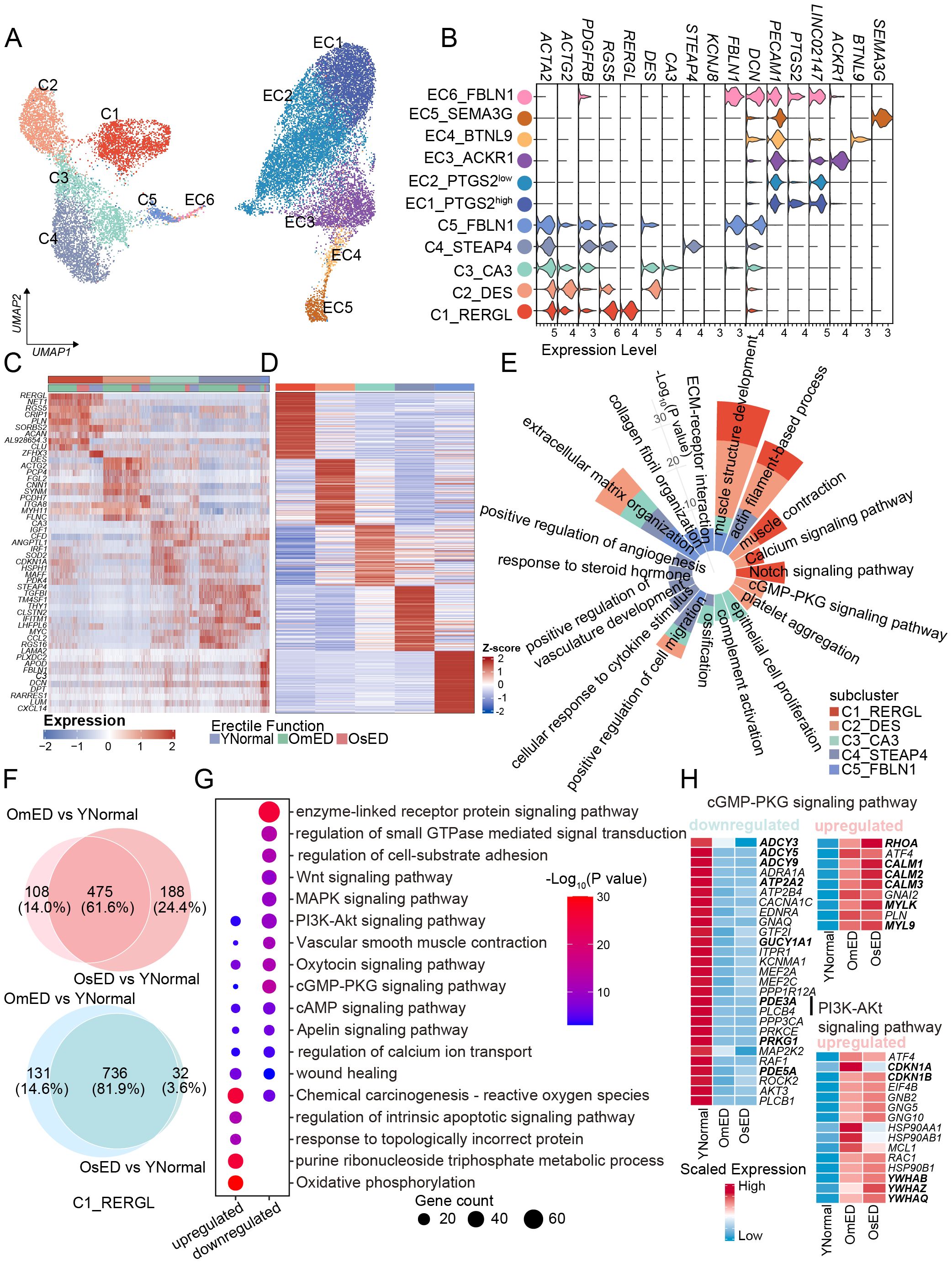 Figure 3. Transcriptional and functional heterogeneity within SMC subclusters and between different groups. (A) UMAP plot showing the different SMC, PC and EC subclusters in human penile CC. (B) Violin plot showing the marker genes of each subclusters. (C) Top 10 DEGs of SMC and PC subclusters, for subcluster color code see (A). (D) Heatmap showing top 100 marker genes of each subclusters based on YNormal group. (E) Circular bar plot showing the pathways associated with marker genes in (D). (F) The Venn diagrams showing the number of upregulated genes (top) and downregulated DEGs (bottom) shared between OmED vs YNormal and OsED vs YNormal in C1_RERGL. (G) Representative pathways of overlapped upregulated (475) and downregulated (736) DEGs in C1_RERGL. (H) Heatmap showing the relative expression levels of genes related to cGMP-PKG signaling pathway in C1_RERGL across different groups. (I) Heatmap showing the relative expression levels of upregulated genes related to PI3K-Akt signaling pathway in C1_RERGL across different groups.