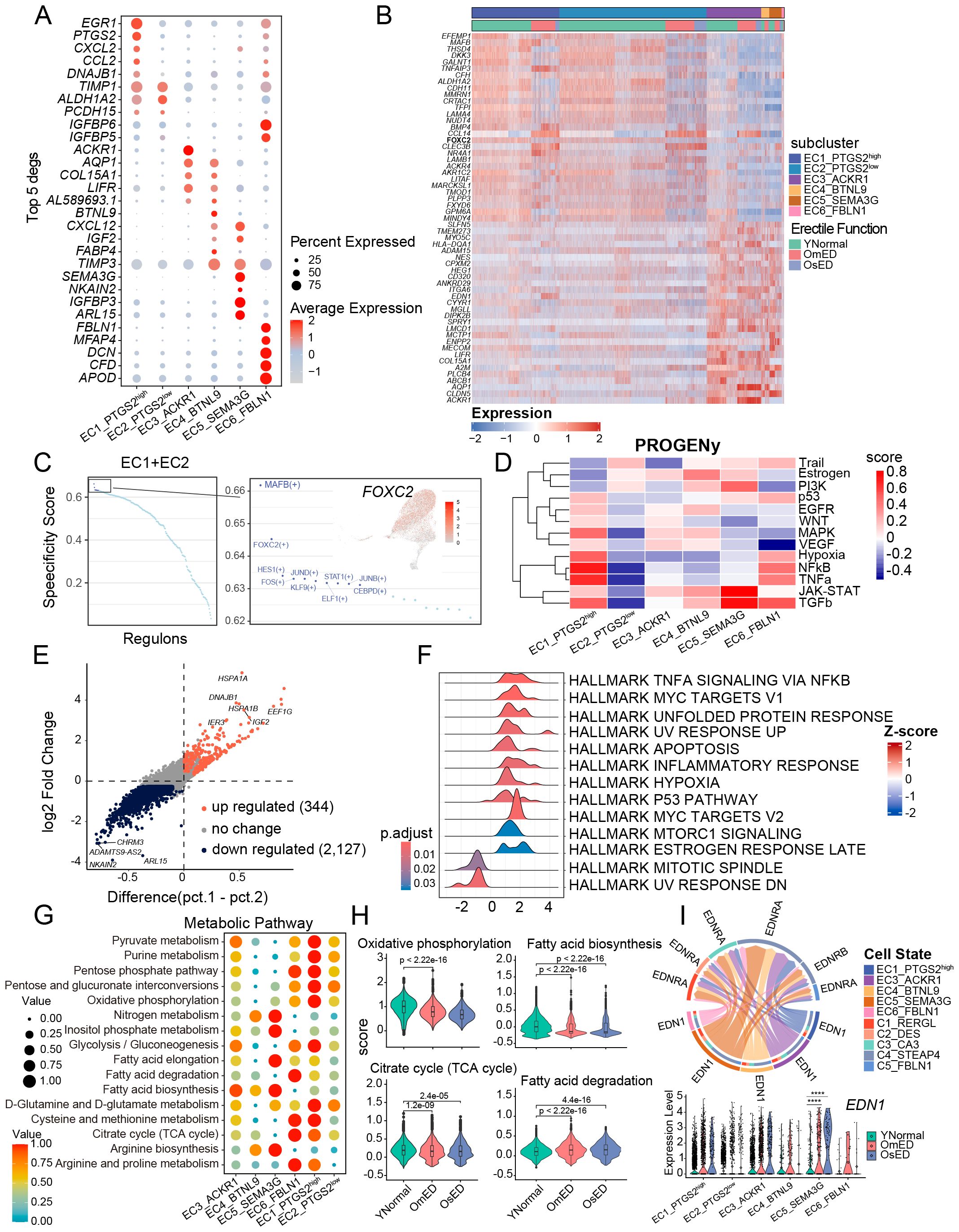 Figure 4. Heterogeneity in EC subclusters and ARED. (A) Bubble diagram showing the expression of top 5 marker genes for each EC subclusters. (B) Heatmap showing the expression profile of differentially expressed genes in CC EC (EC1+EC2) versus pan-vascular EC (EC3+EC4+EC5). (C) Dot plot showing the TF regulons in CC EC. The top 10 TFs are highlighted (right). UMAP showing the distribution and the expression of FOXC2 (right). Red color indicates high expression levels. (D) Heatmap showing the mean pathway activity scores of different EC subclusters. (E) Scatter plot showing the expression changes of all genes in OmED compared to YNormal in EC5_SEMA3G. Genes significantly upregulated in OmED are highlighted in tomato color, whereas genes downregulated are marked in dark color. No changed genes are marked in grey. (F) Ridge plots showing the results of Gene set enrichment analysis (GSEA). Compared with YNormal, the significant HALLMARK pathways enriched in OmED EC5_SEMA3G. DEGs in (E) used. (G) Dot plot of main metabolic characteristics in each EC subclusters, both size and color indicate the effect size. (H) Violin and box plots showing the activity scores of Oxidative phosphorylation, Citrate cycle (TCA cycle), Fatty acid biosynthesis and Fatty acid degradation in EC across different groups. Box shows the median and the quartile range (25%-75%). P values by Wilcoxon test are indicated. (I) Specific signaling ligand-receptors pairs showing in chord diagram (top). Violin plot of the expression levels of EDN1 in the six EC subclusters and different groups (bottom). **** p.adj < 0.0001 (two-sided Wilcoxon rank-sum test).