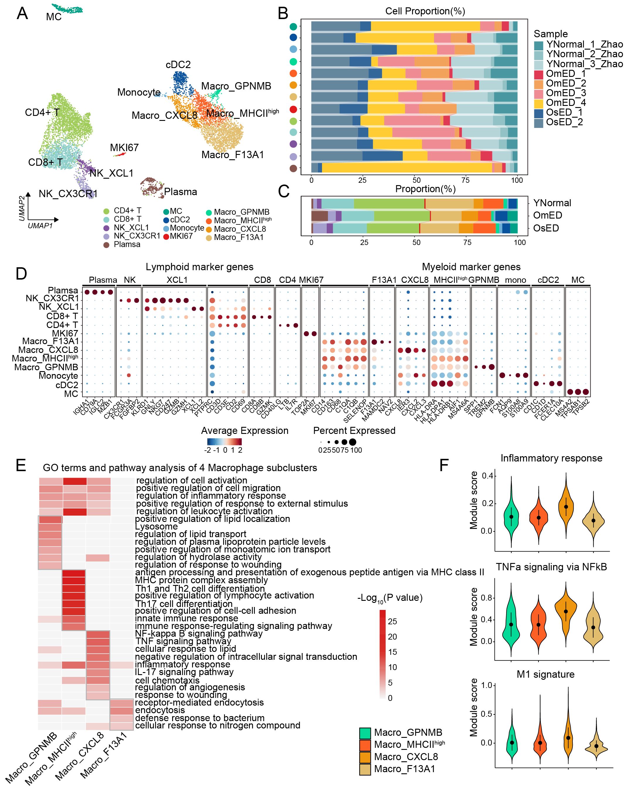 Among myeloid cells, we identified MC and cDC2, a subset of conventional dendritic cells (cDCs), which expressed markers such as CD1C, CD1D, FCER1A, and CLEC10A (54). We also found a small group of monocytes characterized by FCN1, S100A8, and S100A9 (Figure 5D). Additionally, we categorized four subclusters of macrophages (Macro), the predominant innate immune cells: Macro_GPNMB, Macro_MHCIIhigh, Macro_CXCL8, and Macro_F13A1. We computed marker genes, and the expression of DEGs in each macrophage subcluster is illustrated in the heatmap (Supplementary Figure S7H). Pathway enrichment analysis revealed that the marker genes in several macrophage subclusters were associated with similar functions, including “regulation of cell activation”, “regulation of inflammatory response”, “positive regulation of response to external stimulus” and “regulation of leukocyte activation” highlighting their roles in immune responses (Figure 5E; Supplementary Table S4). Furthermore, the DEGs in each macrophage subcluster were enriched in specific GO terms and pathways, indicating functional diversity. For instance, “positive regulation of lipid localization” and “regulation of lipid transport” were enriched in Macro_GPNMB; “antigen processing and presentation of exogenous peptide antigen via MHC class II” and “MHC protein complex assembly” were specific to Macro_MHCIIhigh; Macro_CXCL8 was enriched in the “NF-Kappa B signaling pathway”, “TNF signaling pathway”; while Macro_F13A1 showed enrichment in “defense response to bacterium”. Macro_CXCL8 exhibited high expression of pro-inflammatory genes such as IL1A and IL1B, along with elevated scores for “Inflammatory response”, “TNFa signaling via NFkB” and “M1 signature” (Figure 5F; Supplementary Figure S7I). In contrast, Macro_F13A1 expressed higher levels of anti-inflammatory genes, displayed low scores for immune response signatures, and had elevated scores for “Phagocytosis” (Figure 5F; Supplementary Figures S7I-J). These findings suggest that macrophages had both pro-inflammatory and anti-inflammatory states within the penile microenvironment. The proportion of pro-inflammatory Macro_CXCL8 was found to be increased in ARED (Figure 5C). And using the odds ratio (OR) analysis (55), we found anti-inflammatory Macro_F13A1 was enriched in YNormal, Macro_CXCL8 appeared to be OmED-enriched (Figure 6A), indicating an inflammatory activation. Collectively, these observations suggest that the enrichment of NK_CX3CR1 and Macro_CXCL8 may contribute to the pathogenesis of ARED.