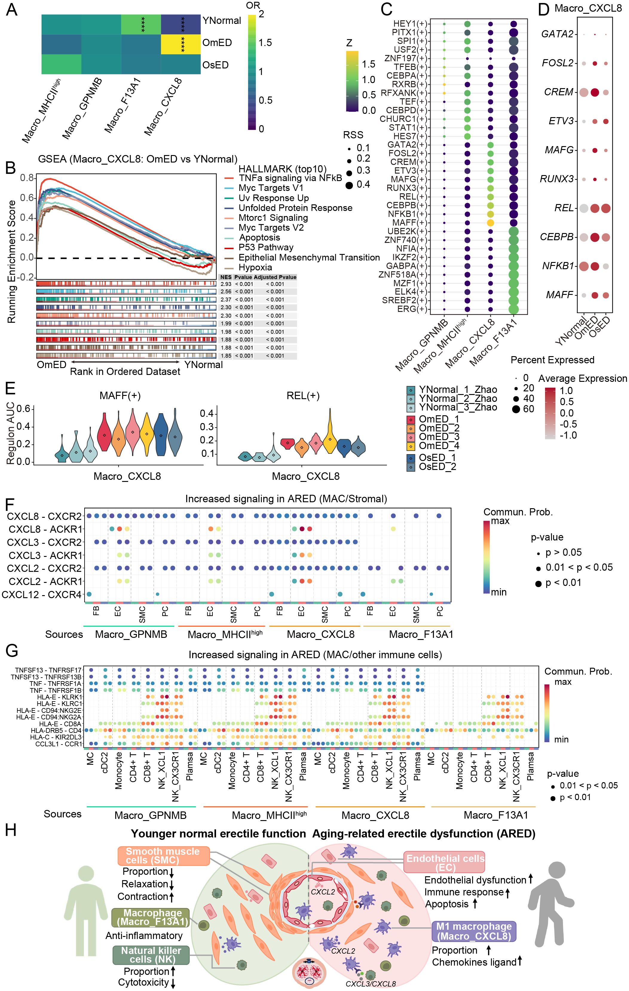 Figure 6. Alterations of Macro_CXCL8 in ARED and cell-cell communications.(A) The heatmap displaying the ORs of four macrophage subclusters occurring in each group. OR > 1.5 indicates that the subcluster is more likely to be distributed in the corresponding group. **** represents adjust P_value < 0.0001 and OR > 1.5 or OR < 0.5. (B) Gene set enrichment analysis (GSEA) showing HALLMARK pathways upregulated in OmED Macro_CXCL8 compared to YNormal Macro_CXCL8. (C) Bubble diagram showing the top 10 TF regulons of four Macro subclusters ordered by regulon-specific score (RSS). (D) Bubble diagram showing the expression levels of Macro_CXCL8 top 10 specific TF in different groups. (E) Regulon AUC scores of Macro_CXCL8 specific regulons across each sample. (F) Bubble plot showing the up-regulated signaling ligand-receptor pairs in ARED between four Macro subclusters and stromal cells. (G) Bubble plot showing the up-regulated signaling ligand-receptor pairs in ARED between four Macro subclusters and other immune cells. (H) A schematic illustration showing the dynamics of cellular dysfunction and molecular signaling in ARED. .