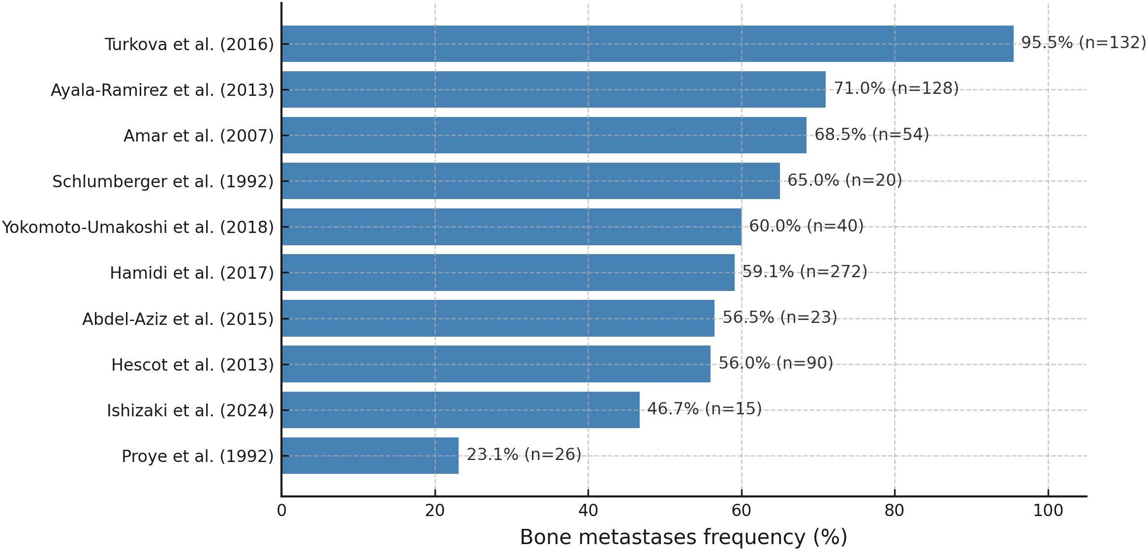 Bone is one of the primary sites of metastasis in patients with PPGLs (7, 34–36), and in up to 20% of cases, the skeleton represents the sole site of metastatic spread (7). mPPGLs are among the solid tumors with a particularly high tropism for bone, with involvement rates comparable to those observed in other osteotropic malignancies such as breast cancer (6, 7, 37). However, data from reported cohorts indicate that the prevalence of BM is highly variable and influenced by differences in study populations. The epidemiological findings across studies are summarized in Figure 1 and in Table S2 (Supplementary Appendix). Direct evidence shows that germline SDHB and SDHA mutations confer predisposition to BM in PPGL. SDHB mutations involve bone in up to 80% of metastatic cases (38), while SDHA mutations also show marked bone tropism when metastases occur (14, 39).