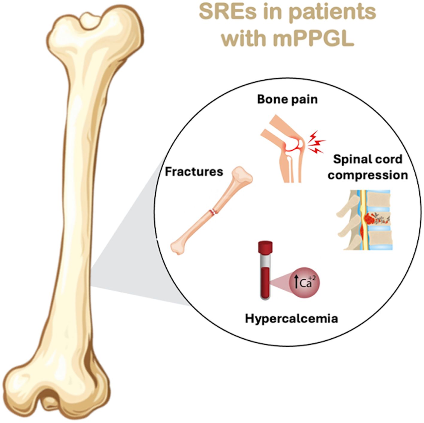 Summary: Bone and lymph nodes are among the most common metastatic sites in malignant PPGL. Skeletal involvement—particularly in paragangliomas—is associated with a high incidence of skeletal-related events (SREs), including pathological fractures, spinal cord compression, and pain. These complications lead to reduced mobility, loss of independence, and decreased survival. Advances in functional and anatomical imaging have improved detection, but optimal management remains complex and requires a multidisciplinary approach.