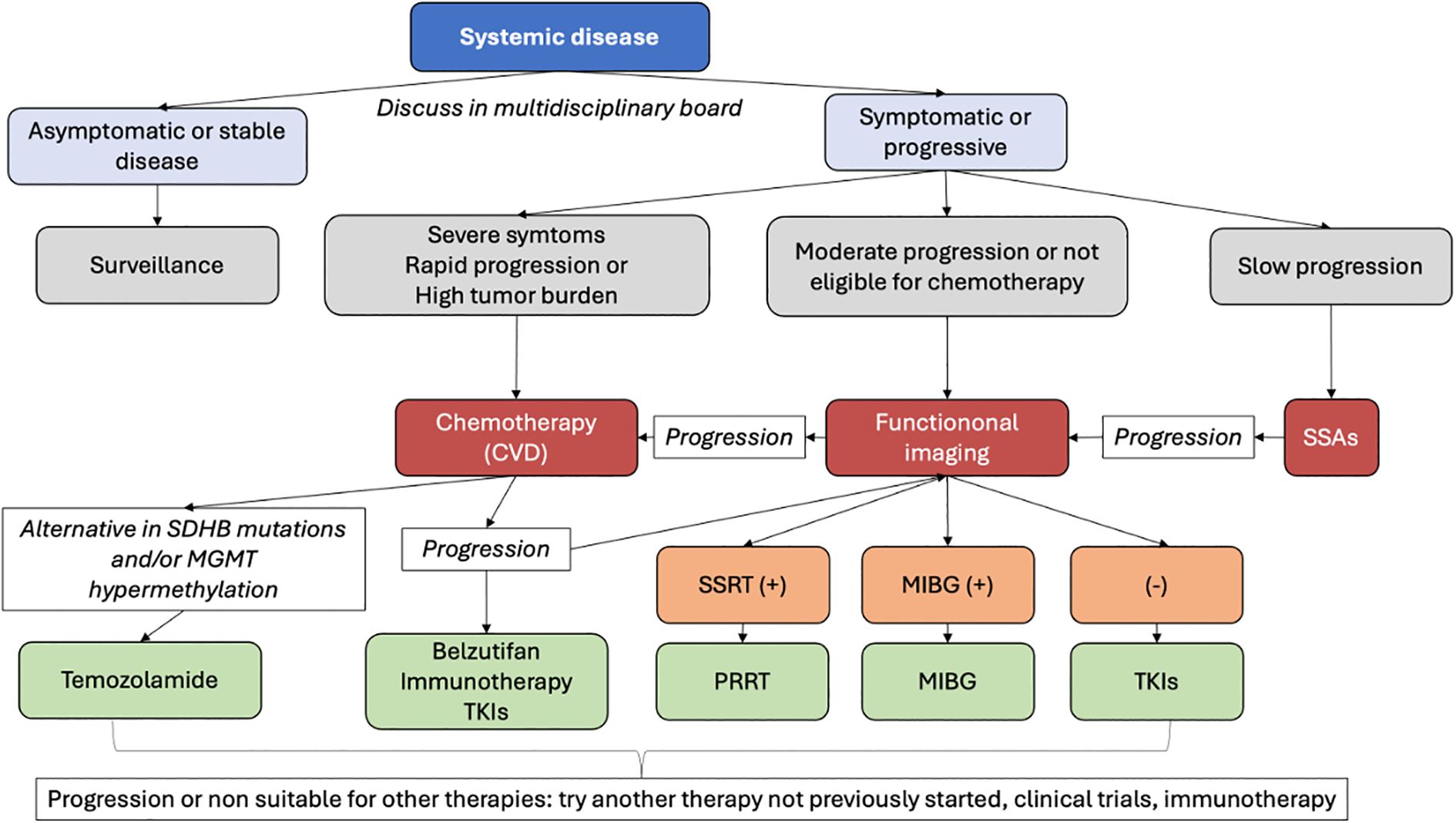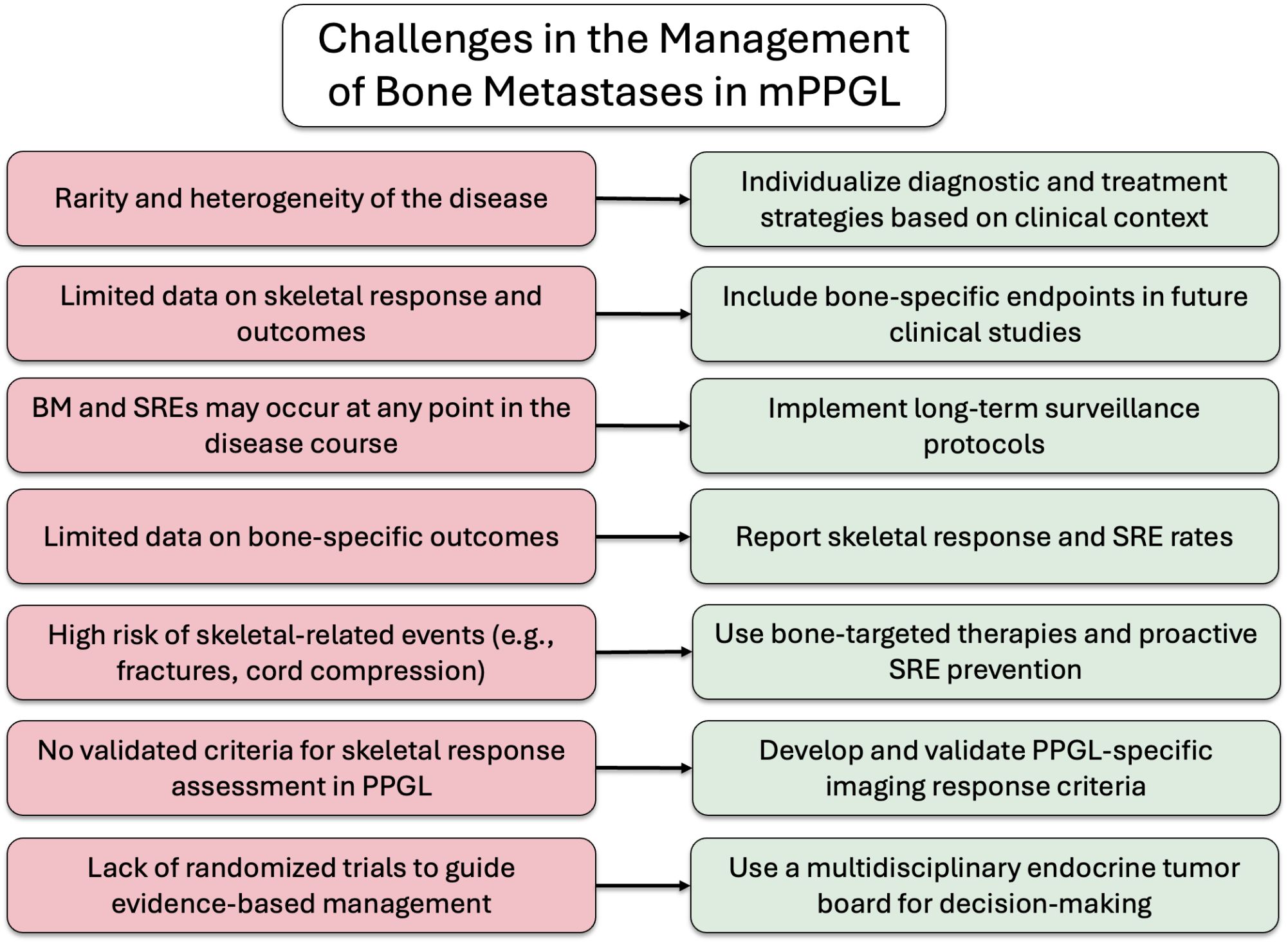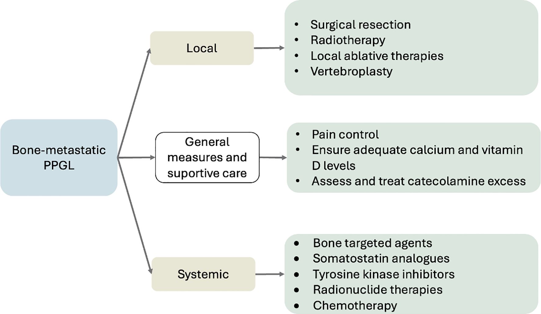 Currently, there are no randomized controlled trials or open-label studies to establish evidence-based guidelines for the management of metastatic bone disease in mPPGL. Treatment strategies should be individualized for each patient, and whenever possible, decisions should be guided by the recommendations of a multidisciplinary endocrine tumor board (6).