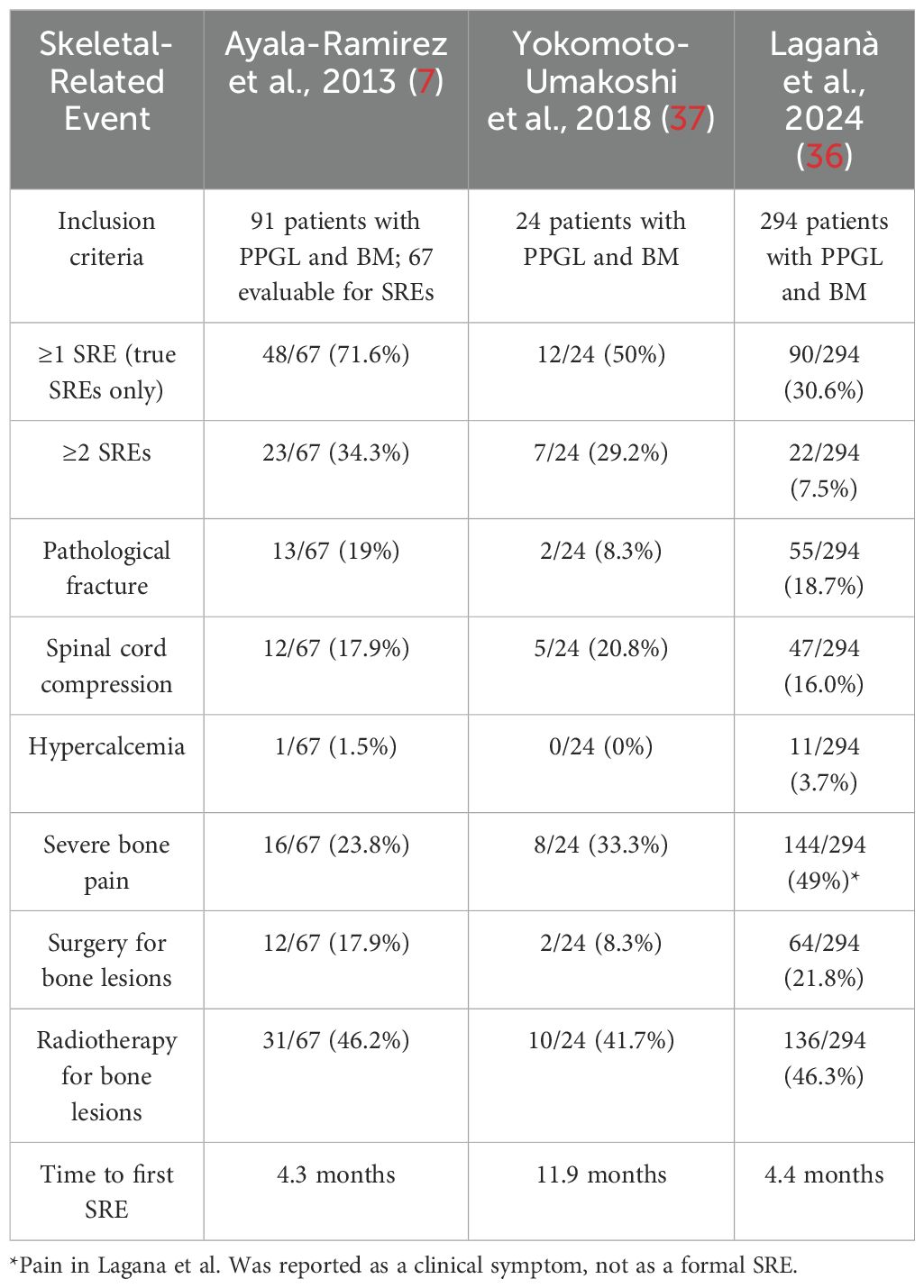 The clinical outcomes of skeletal involvement in PPGL have been described in several cohorts, whose findings are summarized in Table 1 to illustrate the frequency and nature of bone-related complications (7, 36, 37). SREs were common but showed variability across studies. In the study by Ayala-Ramirez et al. (7), 72% of evaluable patients experienced at least one true SRE, with severe pain, pathological fractures, and spinal cord compression occurring in 33%, 27%, and 25% of cases, respectively. In contrast, Laganà et al. (36) reported a lower overall frequency of SREs (31%) in a larger cohort (n = 294), with bone pain (49%), pathological fractures (19%), and spinal cord compression (16%) being the most common manifestations. Hypercalcemia was rare in both studies. Similar outcomes were observed in a Japanese cohort of 24 patients with BM, where 50% developed at least one SRE (Yokomoto-Umakoshi et al., 2018 (37)). In this group, the most frequent SRE was radiation to bone (42%), followed by spinal cord compression (21%), severe bone pain (33%), pathological fracture (8%), and bone surgery (8%). No cases of hypercalcemia were reported, and the median time to the first SRE was 11.9 months. These findings, though derived from a smaller cohort, are consistent with the heterogeneity observed in the larger studies and highlight the need for prospective evaluation of skeletal complications in mPPGL.
