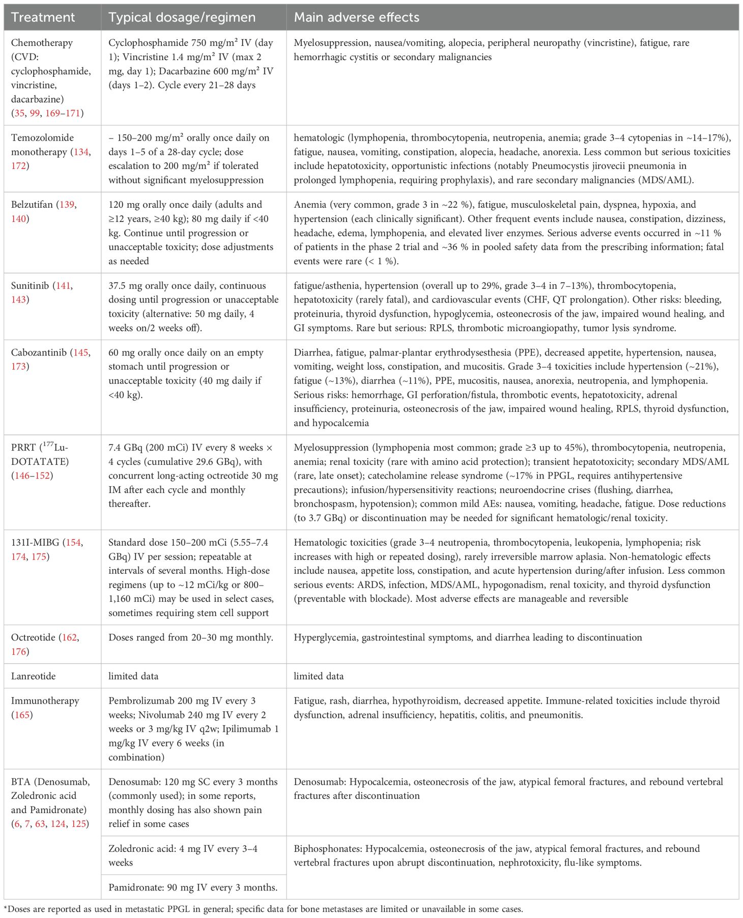 Data derived primarily from case reports, retrospective studies, and, less frequently, clinical trials have demonstrated the efficacy of various treatments for managing mPPGL. However, treatment efficacy at specific anatomical sites, such as bone, has not been extensively addressed due to the rarity and heterogeneity of these tumors (6).