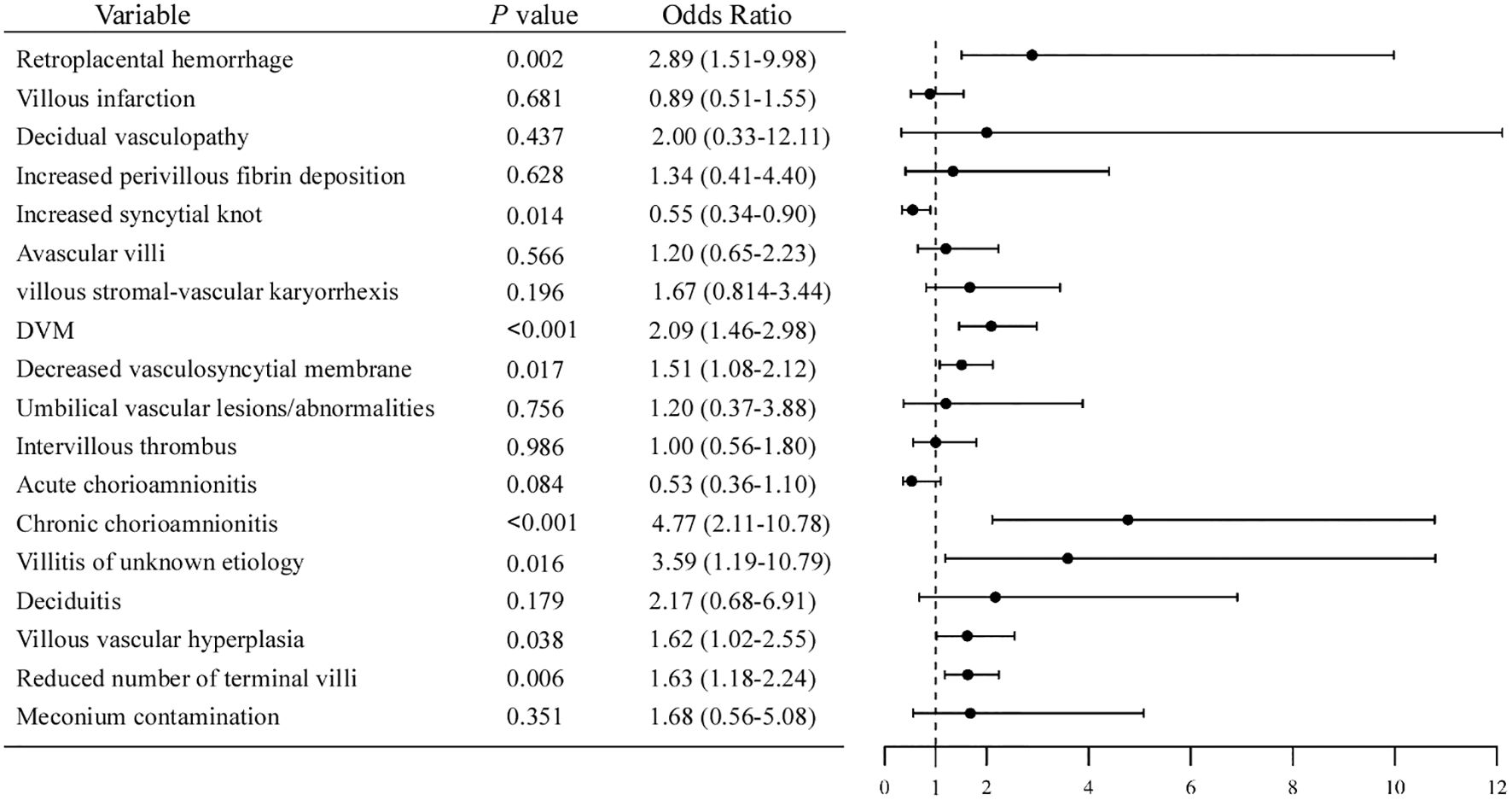 Figure 1. Forest plot of odds ratios for placental pathological features associated with hypothyroidism.