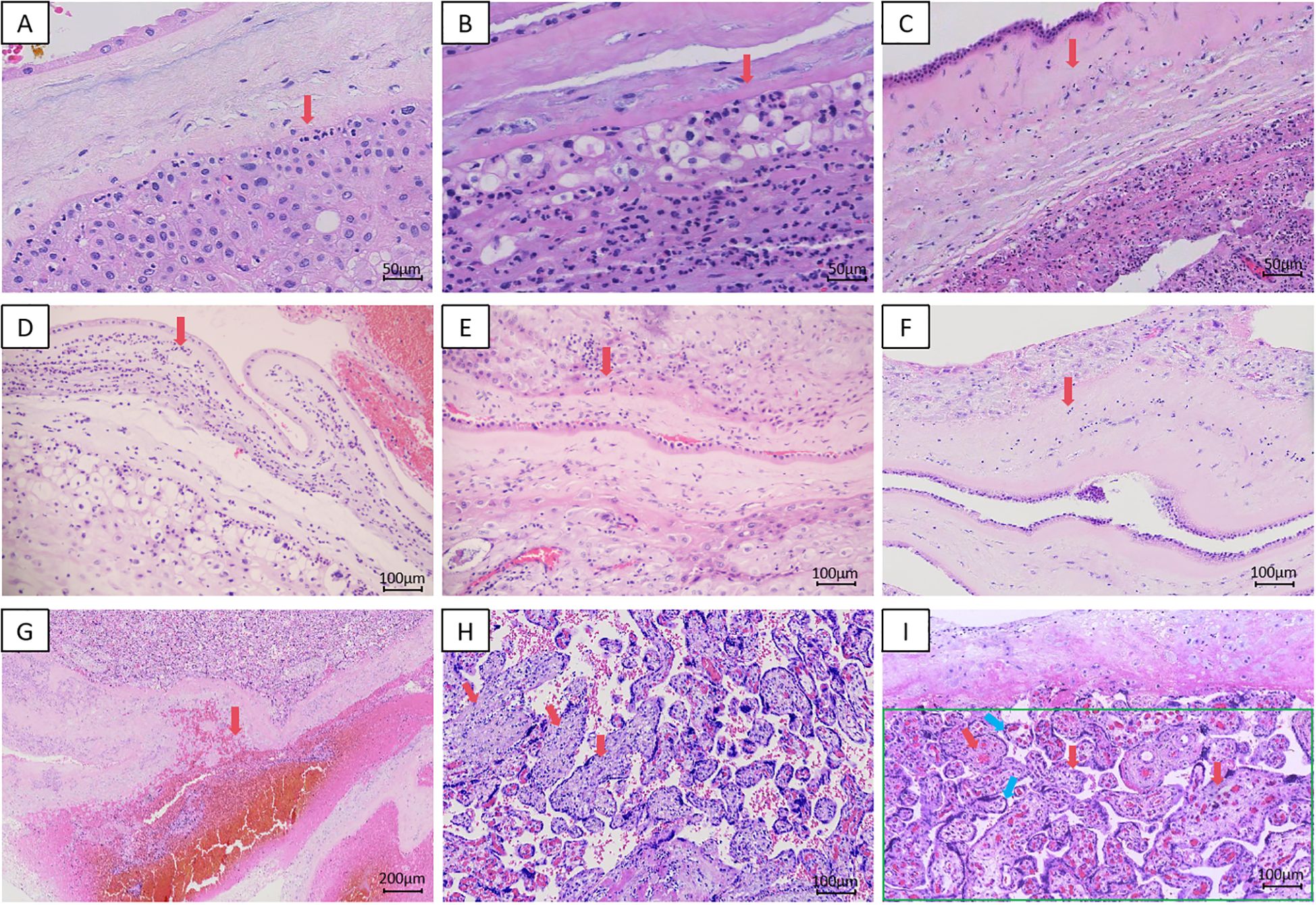 Figure 2. Representative HE-stained histopathological sections of placental tissue. (A) Acute chorioamnionitis,Stage 1, Grade 1, 200x; (B) Acute chorioamnionitis,Stage 1, Grade 2, 200x; (C) Acute chorioamnionitis,Stage 2, Grade 1, 200x; (D) Acute chorioamnionitis,Stage 2, Grade 2, 100x; (E) Chronic chorioamnionitis,Stage 1, Grade 1,100x; (F) Chronic chorioamnionitis,Stage 2, Grade 1,100x; (G) Retroplacental Hematoma, 40x; (H) VUE, 100x; (I) Delayed Villous Maturation (red arrow); Decreased Formation of Vasculosyncytial Membranes (blue arrow); Decreased Formation of Terminal Villi (green box), 100x.