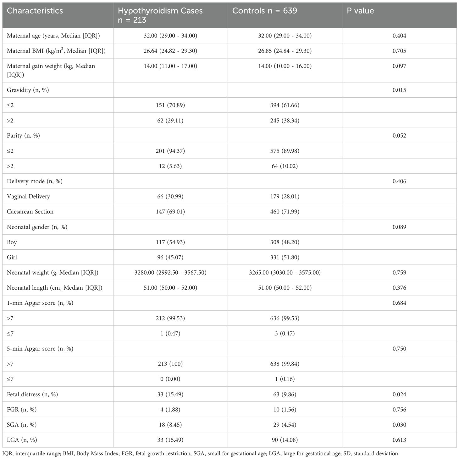 Based on the selection criteria, 852 pregnant women were selected in this study, including 213 cases in the hypothyroidism group and 639 cases in the control group. Clinical data, such as maternal age, gravidity, parity, mode of delivery, and perinatal outcomes, were collected and presented as baseline characteristics in Table 1. The study was granted ethical approval by the Ethics Committee of the Third Affiliated Hospital of Zhengzhou University (2022-111-01, 2022-258-01).