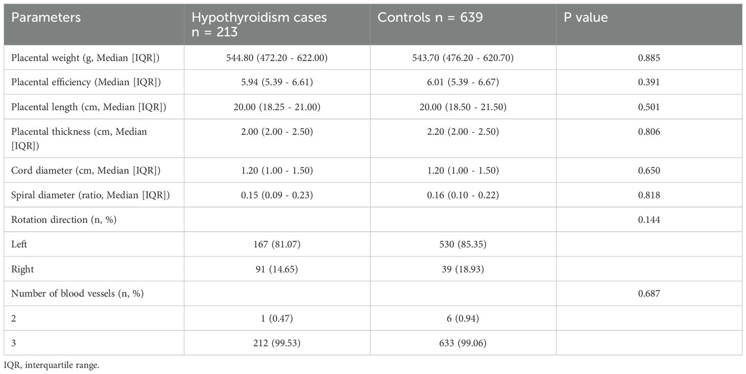Methods: Placental samples from women with singleton pregnancies who gave birth at the Third Affiliated Hospital of Zhengzhou University from June 2022 to December 2023 were collected. A total of 852 participants were recruited according to the inclusion and exclusion criteria, with 213 in the hypothyroidism group and 639 in the control group. Baseline demographic and clinical data of the pregnant women, as well as neonate-related information, were recorded. Gross placental measurements and histological sections from standardized placental samples were evaluated and statistically analyzed.