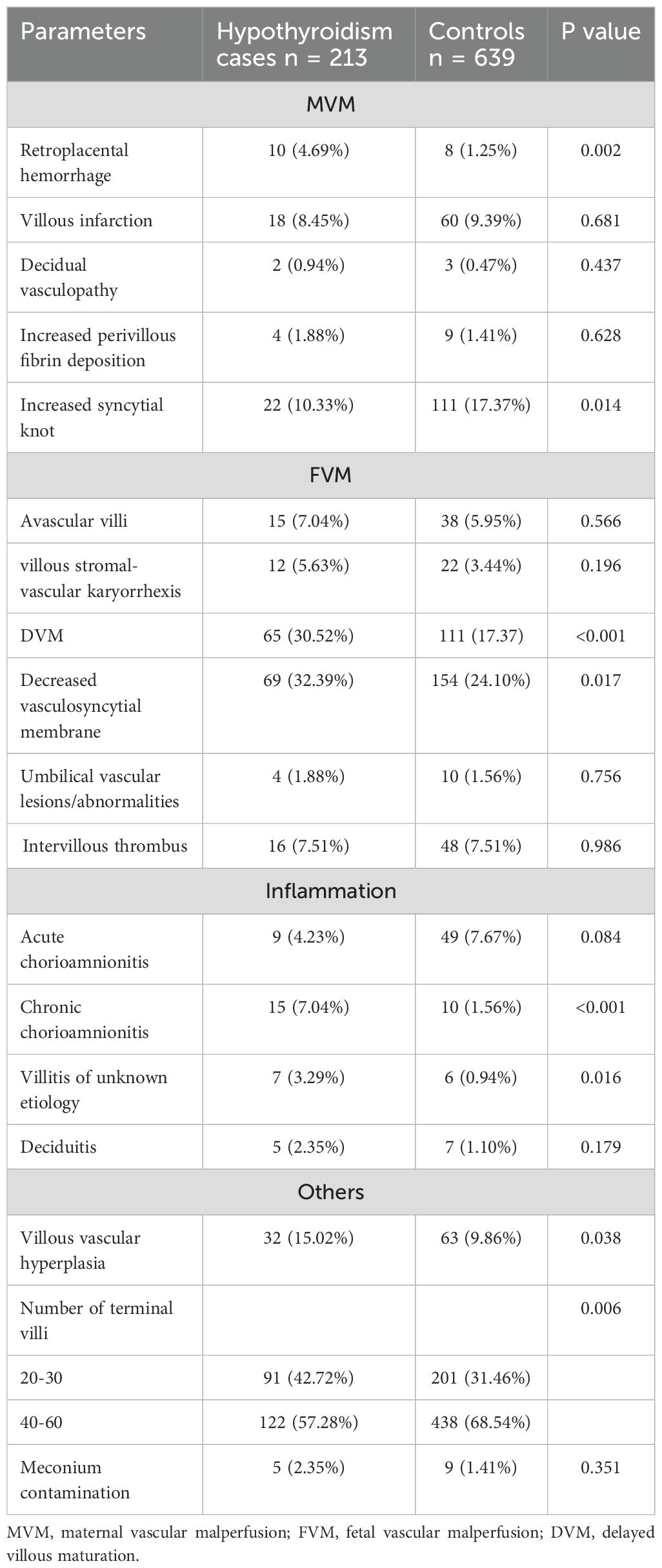 Results: Overall, compared with the control group, insufficient vascular perfusion and inflammation were more frequently observed in the placentae of pregnant women with hypothyroidism. These included retroplacental hemorrhage (4.69% versus 1.25%, P = 0.002) related to maternal vascular malperfusion, delayed villous maturation (30.52% versus 17.37%, P<0.001) and decreased vasculosyncytial membrane (32.39% versus 24.10%, P = 0.017) related to fetal vascular malperfusion, chronic chorioamnionitis (7.04% versus 1.56%, P<0.001), and villitis of unknown etiology (3.29% versus 0.94%, P = 0.016). Additionally, hypothyroidism increased the risk of fetal complications, including fetal distress (15.49% versus 9.68%, P = 0.024) and small for gestational age (8.45% versus 4.54%, P = 0.030).