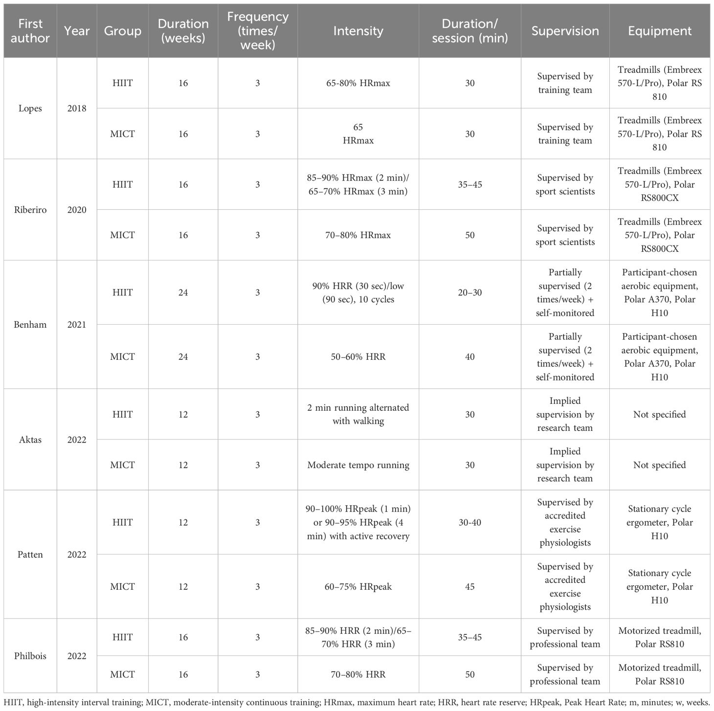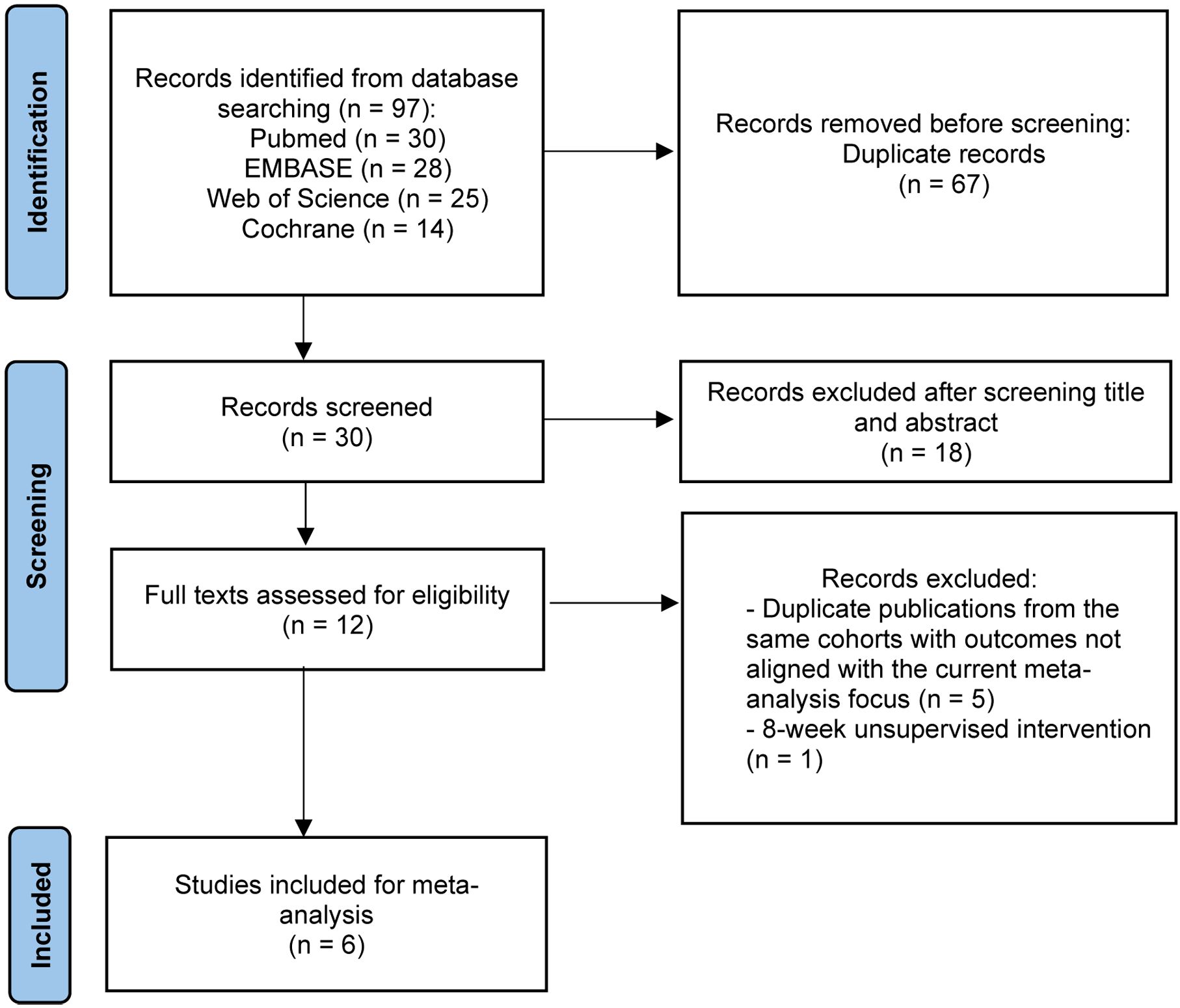 A search of PubMed, EMBASE, The Cochrane Library, and Web of Science found 97 studies. After removing 67 duplicates, 30 studies were screened by title and abstract. Of these, 18 were excluded, leaving 12 studies for full-text review and reference checking. After reviewing the full texts, 6 studies were excluded, with 5 (21–25) excluded due to being duplicate publications or secondary analyses of the same cohort (retaining only the initial study with the most comprehensive outcome data) and 1 (26) excluded due to an 8-week unsupervised home-based HIIT and MICT intervention. Finally, a total of 6 RCTs (27–32) were included (Figure 1). The main details of these studies are presented in Table 1 and Table 2.