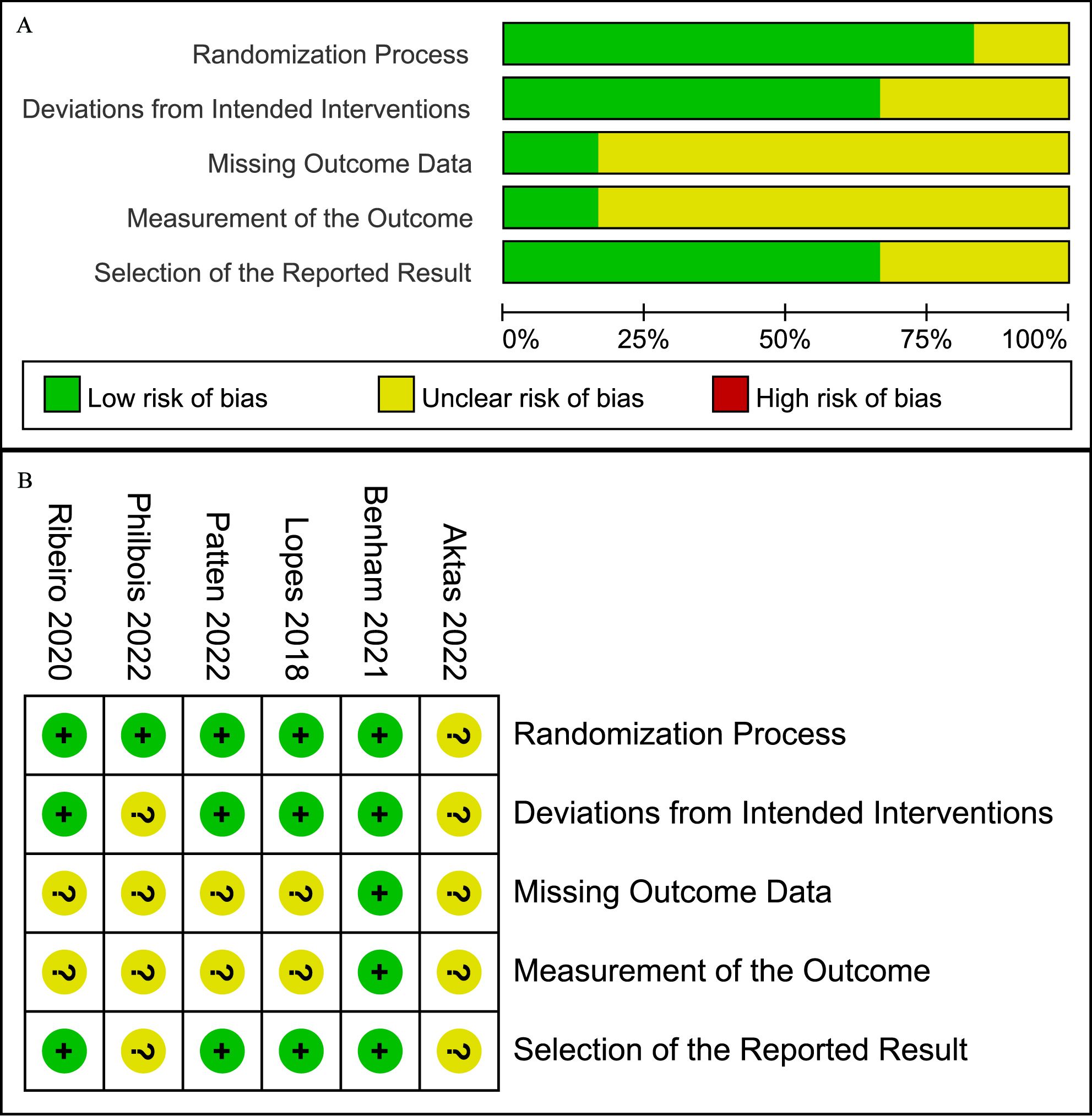The quality of the included studies was assessed using the RoB 2 criteria, as illustrated in Figure 2, with no study exhibiting high risk in any domain. The primary “some concerns” were concentrated in the areas of missing outcome data and measurement of the outcomes. Overall, the quality of the included studies was considered moderate.