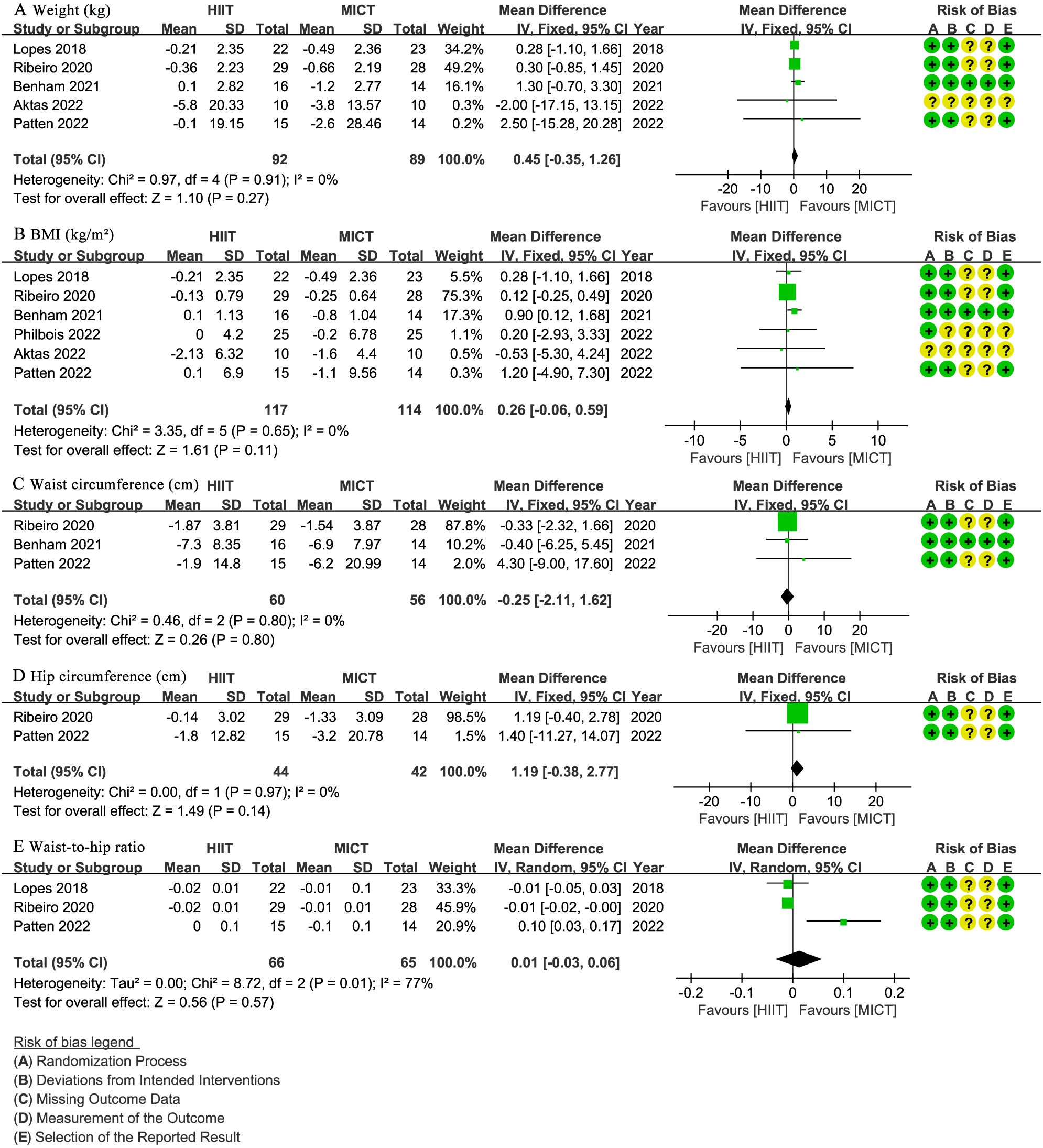 Figure 3. Meta-analysis of: (A) weight (kg), (B) body mass index (BMI) (kg/m2), (C) waist circumference (cm), (D) hip circumference (cm), (E) waist-to-hip ratio (WHR).