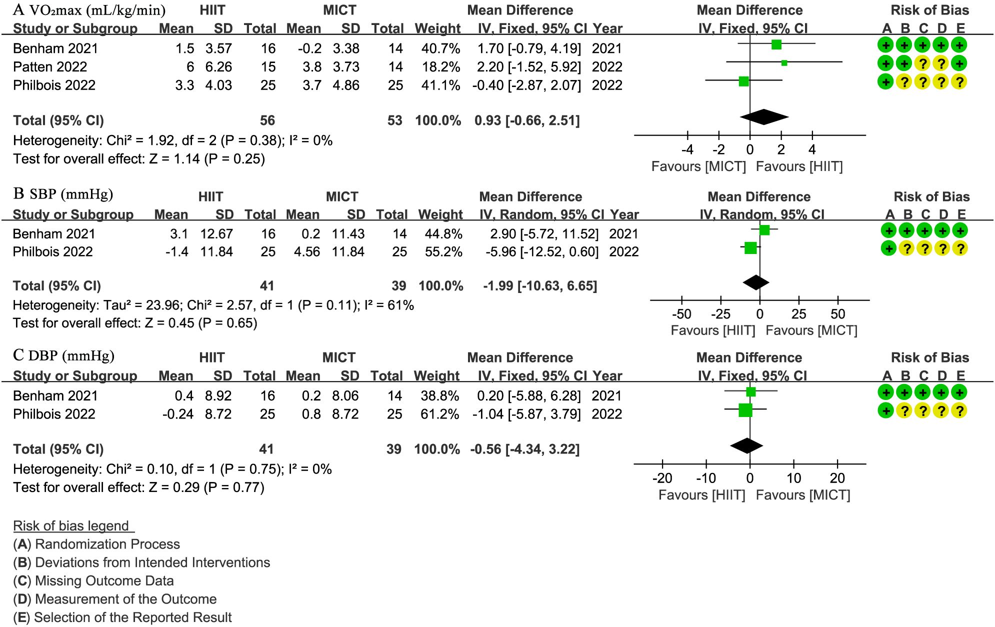 Three studies (28, 30, 31) with 109 patients evaluated VO2max (mL/min/kg), indicating no significant difference between groups (WMD: 0.93; 95% CI: -0.66 to 2.51; I² = 0%; P = 0.25) (Figure 4A). Two studies (28, 31) involving 80 patients reported SBP and DBP (mmHg), with no significant difference observed for SBP (WMD: -1.99; 95% CI: -10.63 to 6.65; I² = 61%; P = 0.65) (Figure 4B) or DBP (WMD: -0.56; 95% CI: -4.34 to 3.22; I² = 0%; P = 0.77) (Figure 4C).