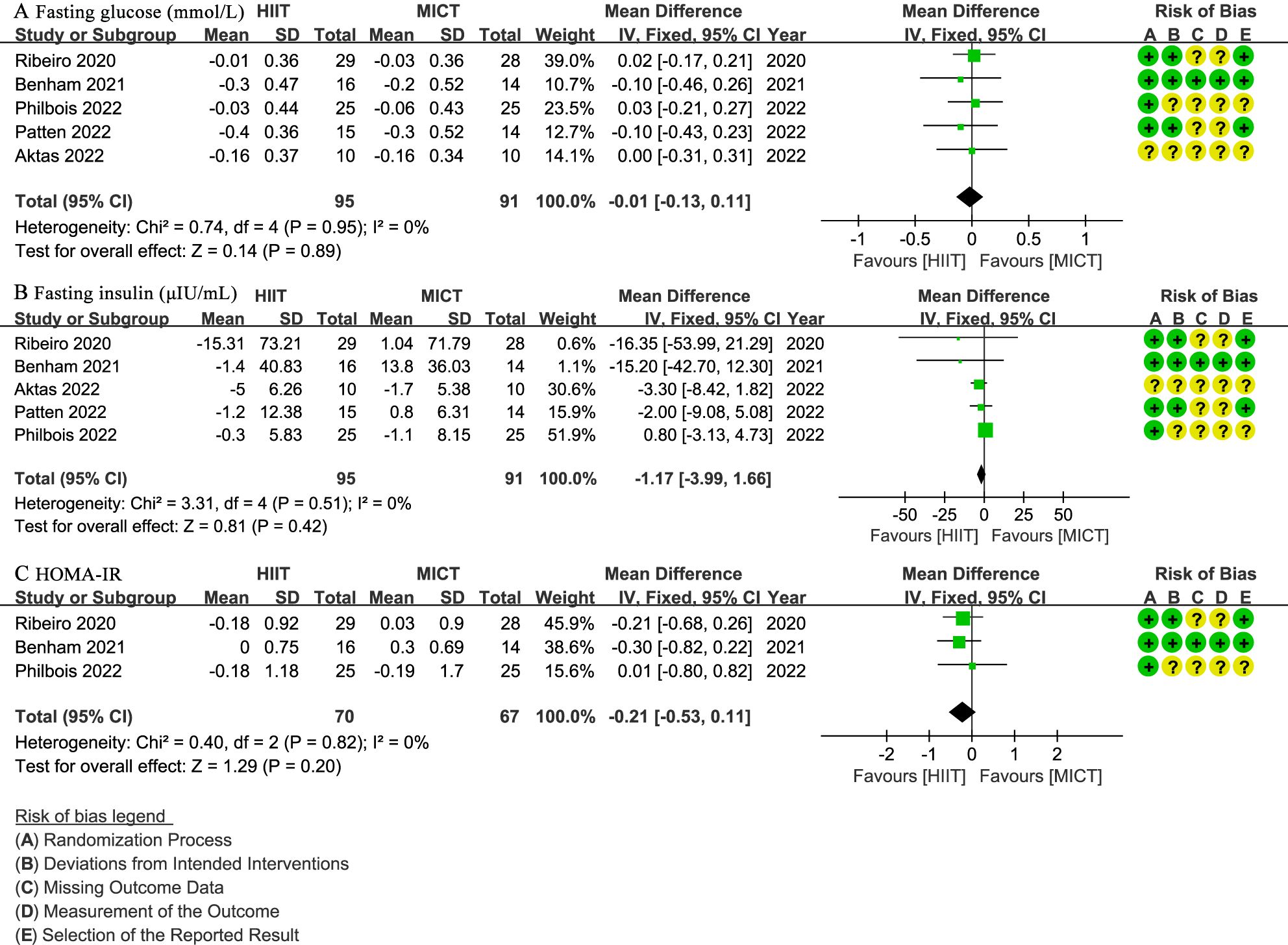 Five studies (27, 28, 30–32) involving 186 patients assessed fasting glucose (mmol/L), indicating no significant difference between the HIIT and MICT groups (WMD: -0.01; 95% CI: -0.13 to 0.11; I² = 0%; P = 0.89) (Figure 5A). The same five studies (27, 28, 30–32) reported fasting insulin (µIU/mL), with no significant difference observed (WMD: -1.17; 95% CI: -3.99 to 1.66; I² = 0%; P = 0.42) (Figure 5B). Three studies (28, 31, 32) with 137 patients evaluated HOMA-IR, showing no significant difference (WMD: -0.21; 95% CI: -0.53 to 0.11; I² = 0%; P = 0.20) (Figure 5C).