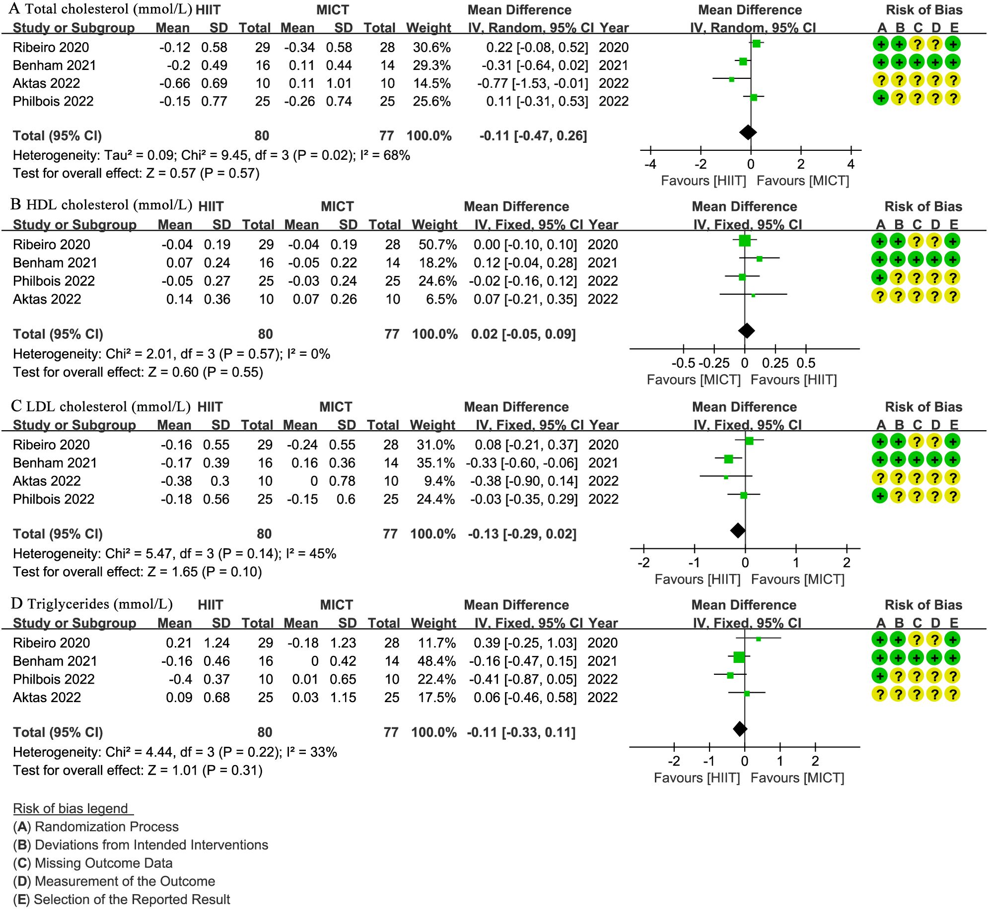 Figure 6. Meta-analysis of: (A) total cholesterol (mmol/L), (B) high-density lipoprotein (HDL) cholesterol (mmol/L), (C) low-density lipoprotein (LDL) cholesterol (mmol/L), (D) triglycerides (mmol/L).
