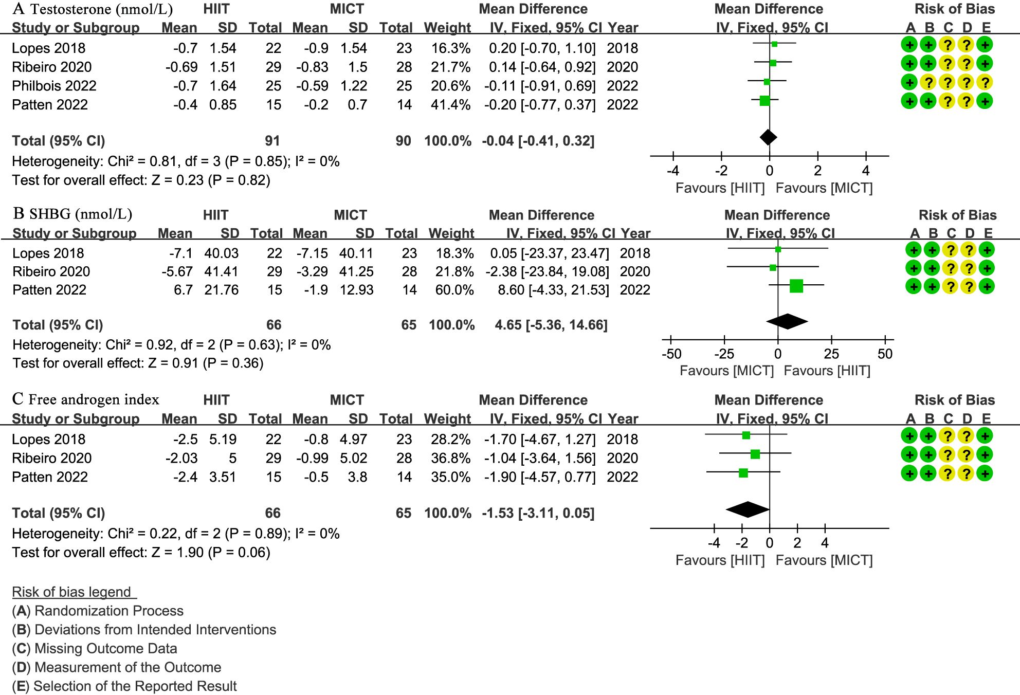 Figure 7. Meta-analysis of: (A) testosterone levels (nmol/L), (B) sex hormone binding globulin (SHBG) (nmol/L), (C) free testosterone index (FAI).