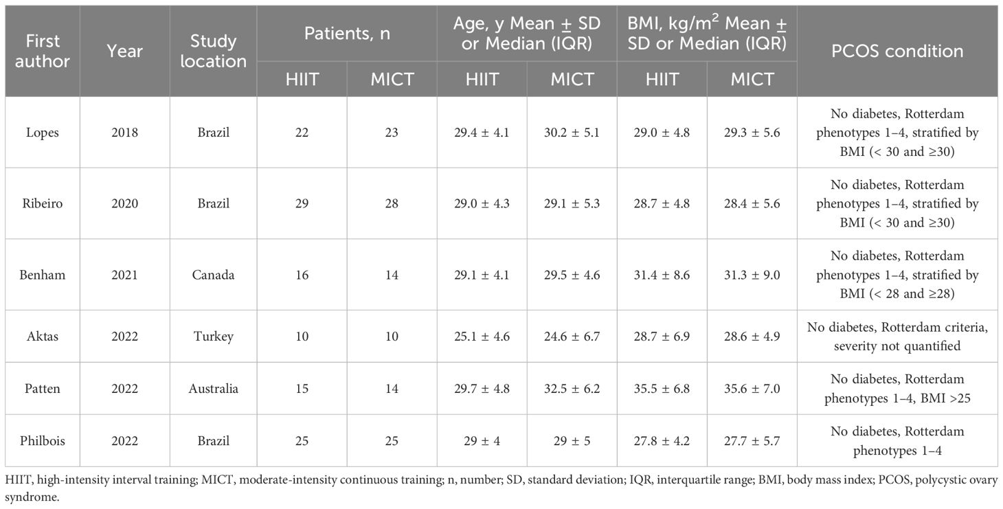 Despite the growing interest in exercise as a therapeutic intervention for PCOS, there remains limited high-quality evidence directly comparing the effects of HIIT and MICT head-to-head. Previous systematic reviews, often limited by small sample sizes and the inclusion of broad exercise interventions or non-direct comparisons, have yielded diverse and sometimes inconclusive findings regarding the relative superiority of one modality over another for specific PCOS outcomes (14–17). Therefore, a comprehensive and updated meta-analysis exclusively focusing on randomized controlled trials (RCTs) directly comparing HIIT and MICT in women with PCOS is critically needed to provide precise and robust evidence for clinical recommendations.