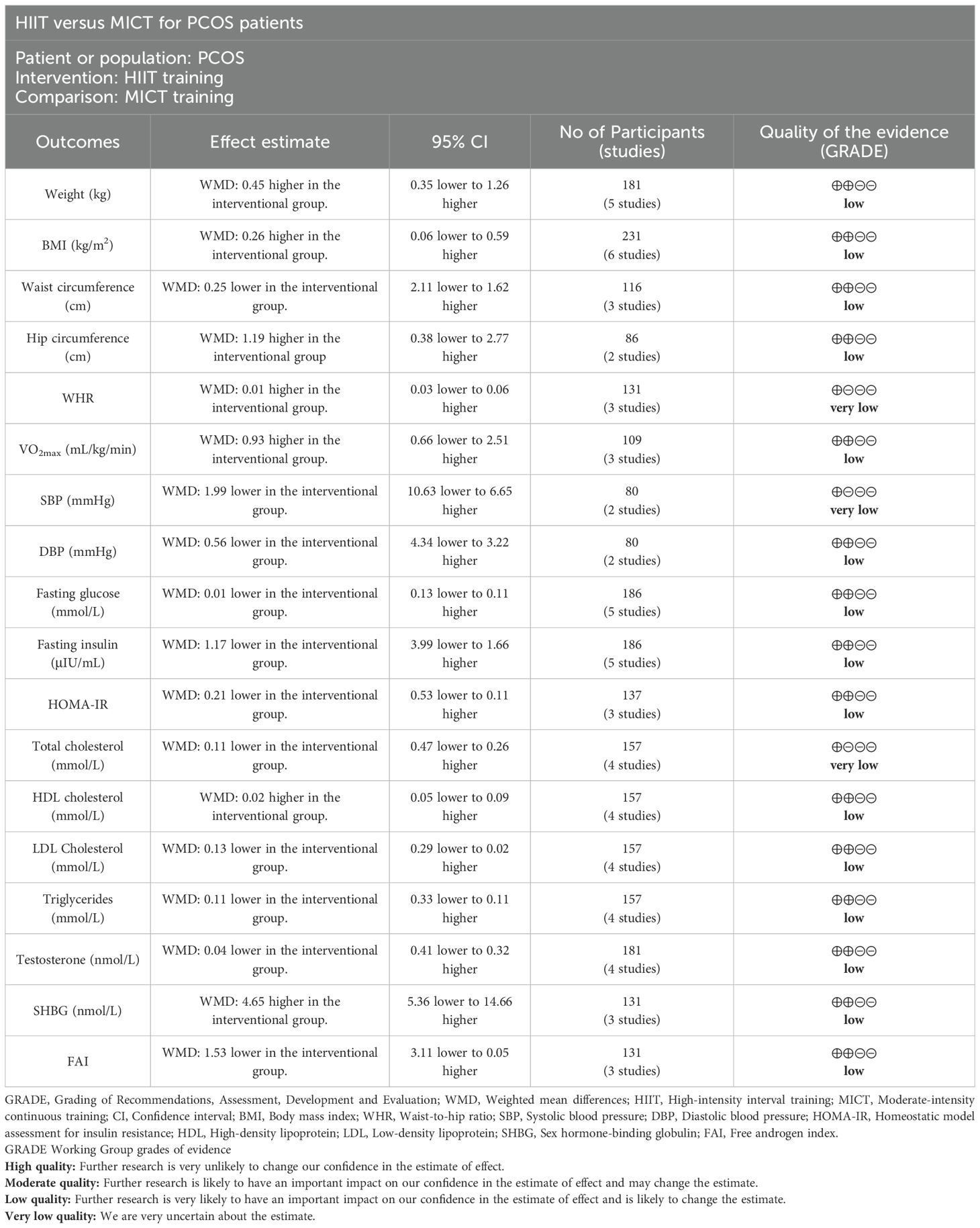 To our best knowledge, our meta-analysis is the first to exclusively include RCTs directly comparing HIIT and MICT in women with PCOS. This rigorous focus on head-to-head comparisons, distinct from prior reviews that included broader exercise interventions or non-direct comparisons, ensures a more precise evaluation of their comparative effectiveness. Although the certainty of evidence for many outcomes remains very low to low due to limited studies and small sample sizes, our findings represent the highest quality evidence currently available in this specific comparative domain. Despite conclusions similar to Colombo et al. (15) regarding the lack of clear superiority, our expanded and updated dataset offers a more comprehensive and current perspective.
