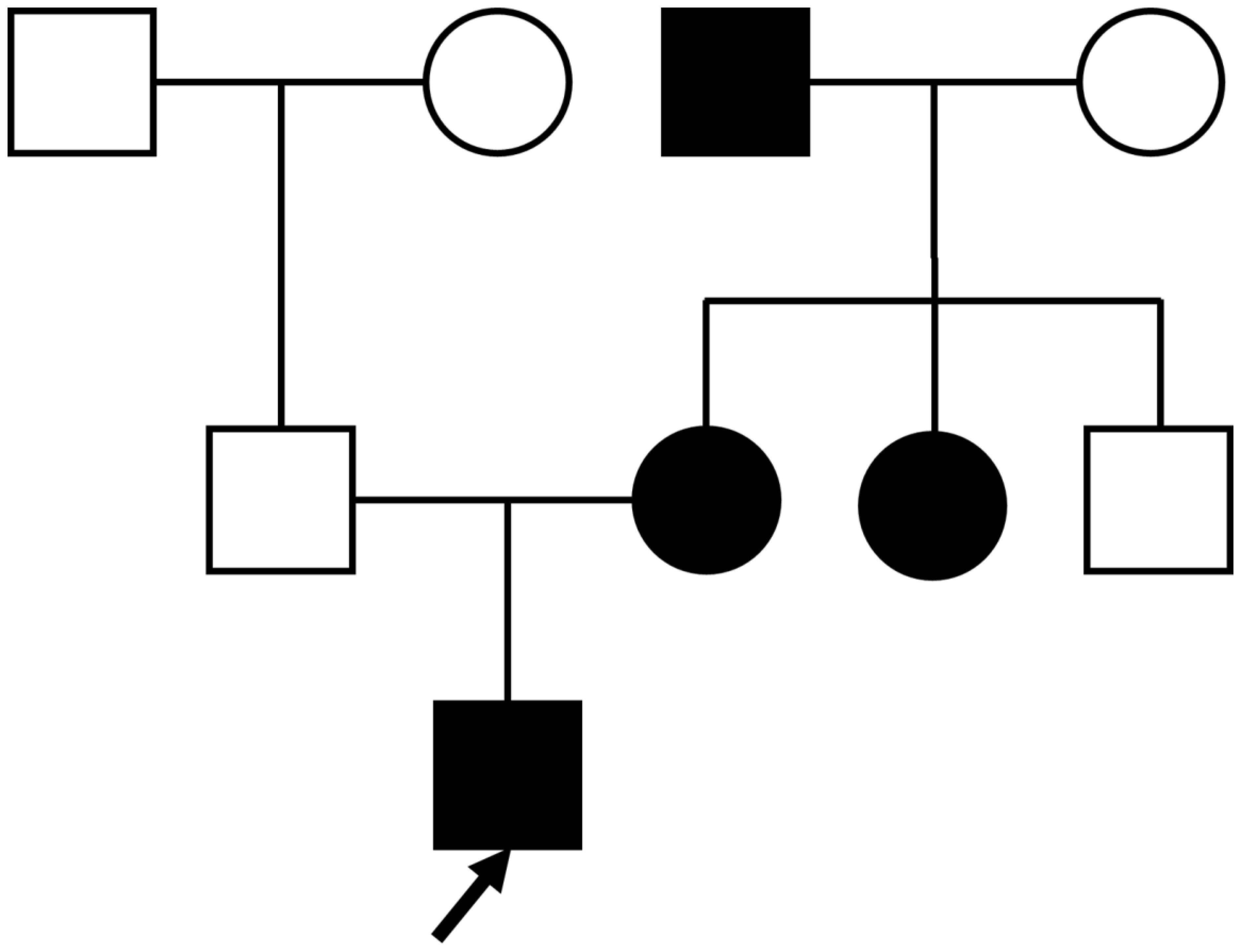 Figure 1. Proband’s family tree: Squares represent males, and circles represent females. The black symbol represents individuals with diabetes; the blank symbol represents normal individuals. The arrow indicates the proband.