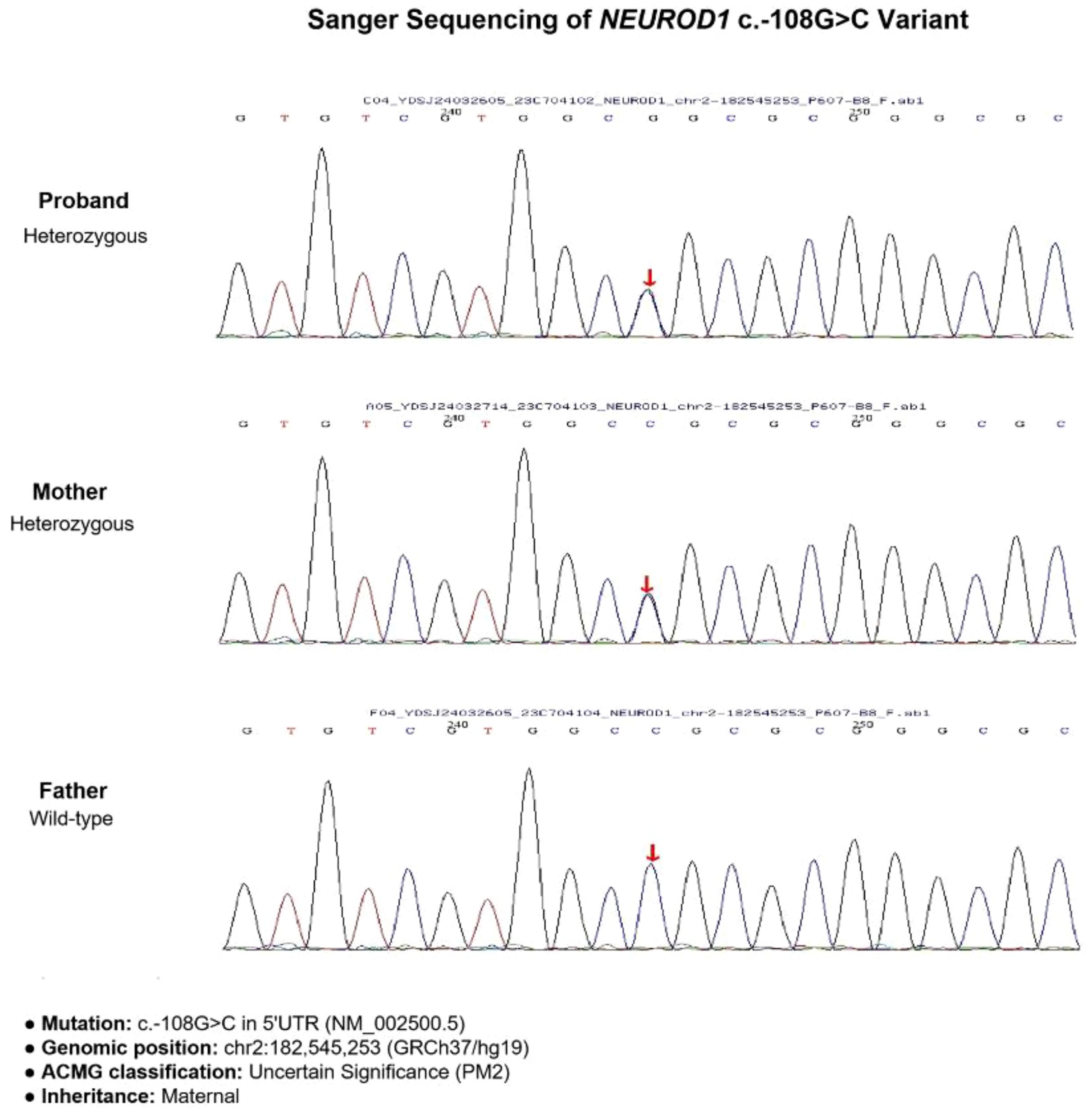 Whole-exome sequencing identified a heterozygous variant in the NEUROD1 gene (NM_002500.5): c.-108G>C, located in the 5′UTR (Figure 2). According to American College of Medical Genetics and Genomics (ACMG) guidelines (10), this variant was classified as of “uncertain significance” (PM2_Supporting: absent from population databases; PP1_Moderate: co-segregation with diabetes within the maternal lineage). Sanger sequencing confirmed the presence of the variant in both the proband and his diabetic mother, while it was absent in his non-diabetic father. No pathogenic variants were identified in other MODY-associated genes, including GCK and HNF1A.