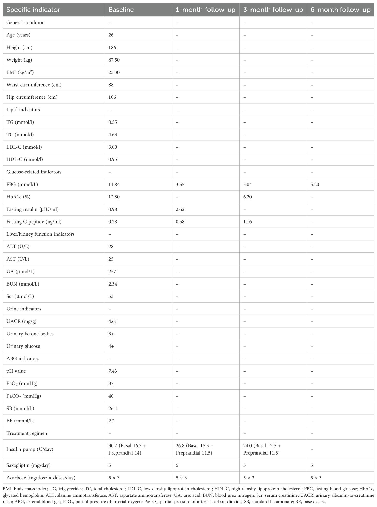 The patient’s glycated hemoglobin (HbA1c) level was elevated at 12.80%. An insulin release test revealed a fasting insulin level of 0.98 μIU/ml (reference range: 2.60–24.90 μIU/ml), with 1h and 2h postprandial insulin levels of 3.90 μIU/ml and 6.82 μIU/ml, respectively. A C-peptide release test showed markedly reduced fasting C-peptide at 0.28 ng/ml (reference range: 1.10–4.40 ng/ml), with postprandial 1h and 2h C-peptide levels of 0.67 ng/ml and 0.92 ng/ml, respectively. Testing for islet autoantibodies, including glutamic acid decarboxylase autoantibodies, was negative. Blood lipid profile results were within normal limits: total cholesterol (TC) 4.63 mmol/L (reference value: 2.90–5.68 mmol/L), triglycerides (TG) 0.55 mmol/L (reference value: 0.00–1.70 mmol/L), low-density lipoprotein cholesterol (LDL-C) 3.00 mmol/L (reference value: 0.00–3.37 mmol/L), and high-density lipoprotein cholesterol (HDL-C) 0.95 mmol/L (reference value: 0.91–2.06 mmol/L). Liver function indicators were normal: alanine aminotransferase (ALT) 28 U/L (reference value: 9–50 U/L) and aspartate aminotransferase (AST) 25 U/L (reference value: 15–40 U/L). Renal function was also normal: serum creatinine (Scr) 53 μmol/L (reference value: 57–97 μmol/L), uric acid (UA) 257 μmol/L (reference value: 293–430 μmol/L), and blood urea nitrogen (BUN) 2.34 mmol/L (reference value: 3.10–8.00 mmol/L). The urinary albumin-to-creatinine ratio (UACR) was 4.61 mg/g. Urinalysis showed 3+ ketone bodies and 4+ glucose. Arterial blood gas (ABG) analysis revealed no metabolic acidosis, with pH 7.43 (reference value: 7.35–7.45), partial pressure of arterial oxygen (PaO2) 87 mmHg (reference value: 80–100 mmHg), partial pressure of arterial carbon dioxide (PCO2) 40 mmHg (reference value: 35–45 mmHg), standard bicarbonate (SB) 26.4 mmol/L (reference value: 22–27 mmol/L), and base excess (BE) 2.2 mmol/L (reference value: −3.0–3.0 mmol/L).