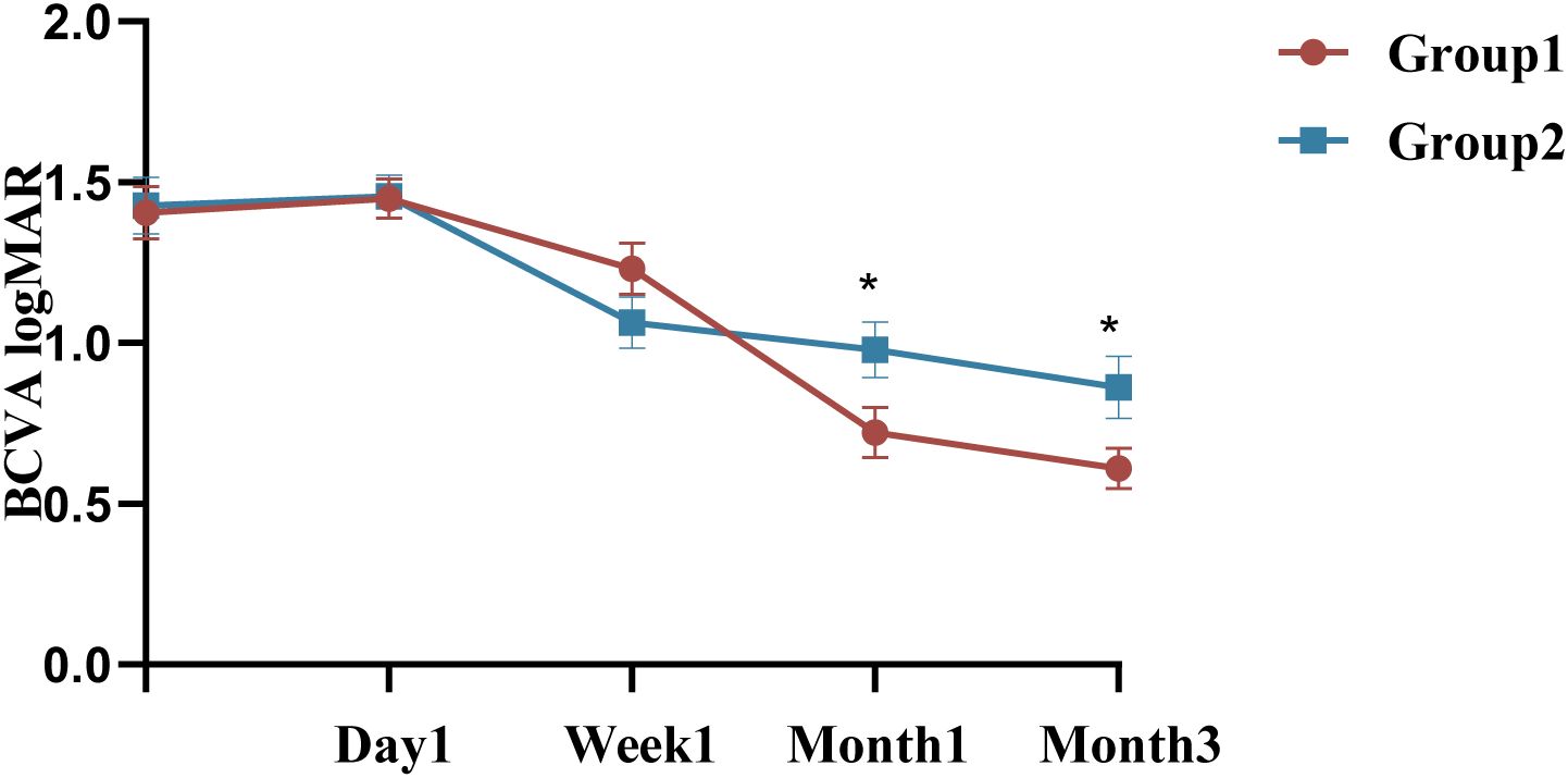 Figure 2. Changes and differences in BCVA between the two groups. BCVA: best corrected visual acuity; *P ≤ 0.05 (unadjusted); n = 40 eyes per group.
