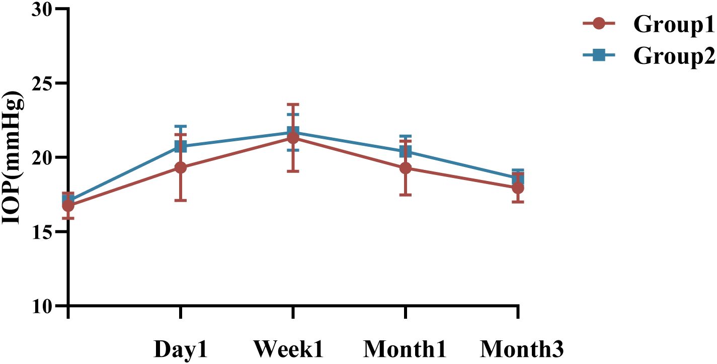 Group 1 had a mean preoperative IOP of 16.75 ± 2.65mmHg, with no significant variation in IOP at the 1st day, 1st month, or third month compared to baseline, P >0.05 (Figure 3). However, at the 1st week, the IOP in Group 1 was 19.75 [16.25, 24.40] mmHg, with a significant difference compared to baseline (P <0.05, Bonferroni adjusted). In contrast, the mean preoperative IOP in Group 2 was 17.07 ± 2.54 mmHg, with significant changes observed at all follow-up visits (P <0.05, Bonferroni adjusted). IOP measurements showed no statistically significant between Group 1 and 2 at any follow-up visit (P = 0.567, P = 0.721, P = 0.451, and P = 0.352, respectively), detailed summary is provided in Table 4. All patients with elevated IOP were treated with topical eye drops, and anterior chamber puncture was performed in a very small number of patients.