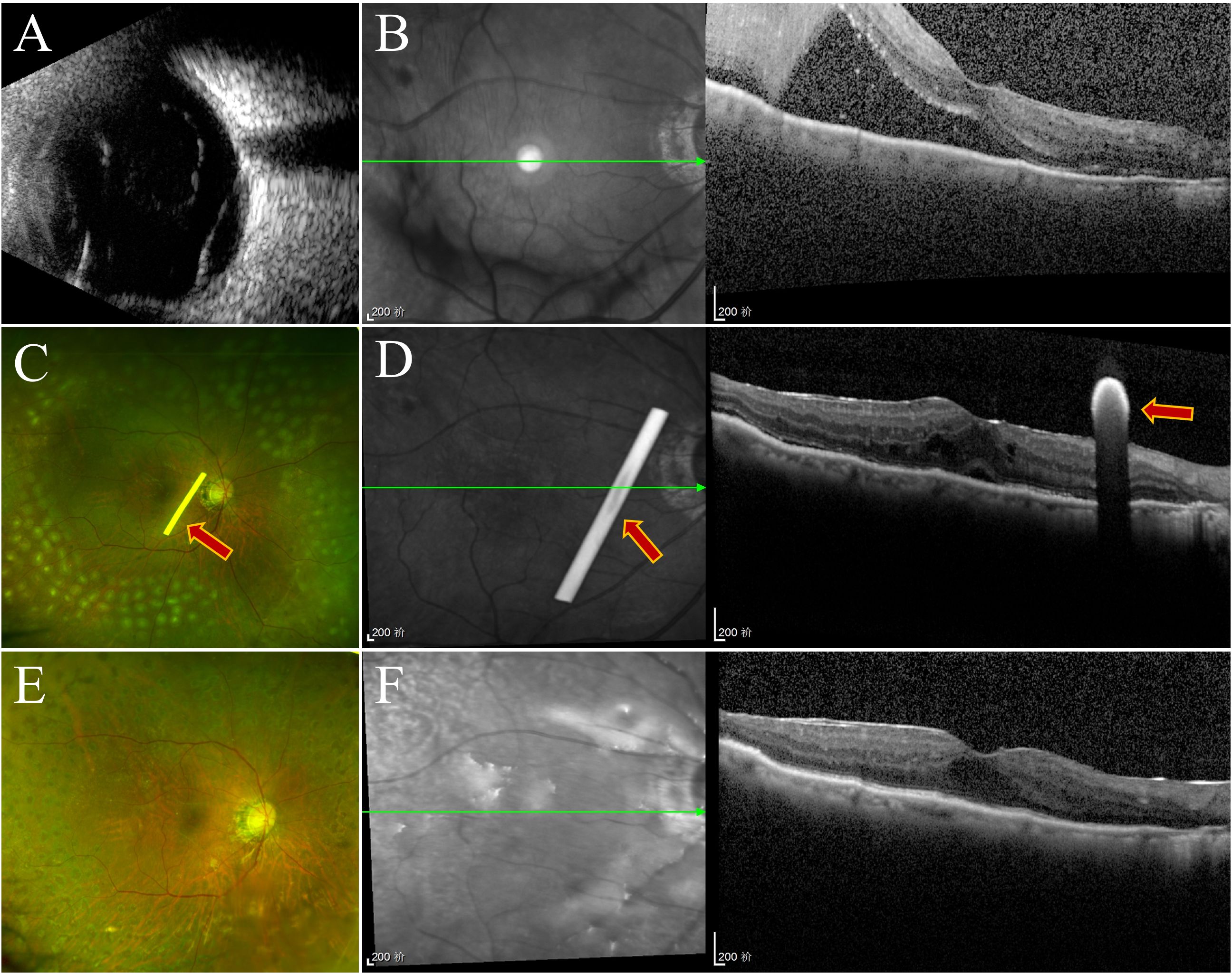 Figure 4. Follow-up examination of one patient in group 1. (A) Ultrasonography of the oculus dexter shows inferior retinal detachment. (B) Before surgery, OCT revealed retinal detachment. (C) SLO revealed silicone oil within the vitreous cavity, residual laser markings across the retina, and a white dexamethasone implant rod (marked with arrows). (D) OCT revealed that the retina was repositioned at the first week, and the dexamethasone implant was placed near the macular area (marked with arrows). (E, F) Three months later, the retina was repositioned, and the implant had been completely absorbed.