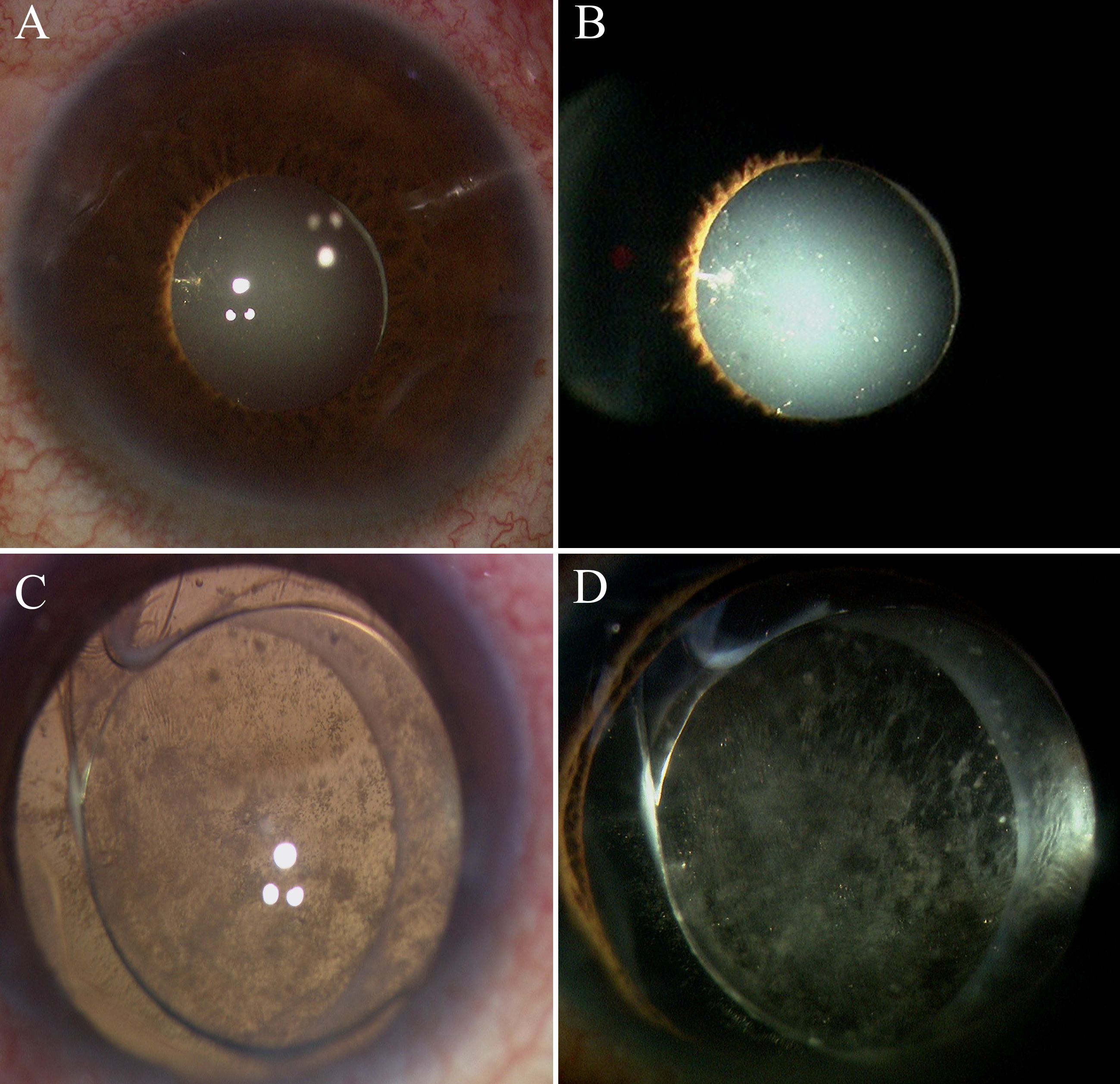 Figure 5. Intraoperative anterior segment observation in group 1 and group 2. (A, B) are from Group 1, and (C, D) are from Group 2. (A, B) No anterior proliferation was visible under the microscope during surgery. (C, D) Posterior capsule opacification and extensive anterior proliferative membranes were visible.