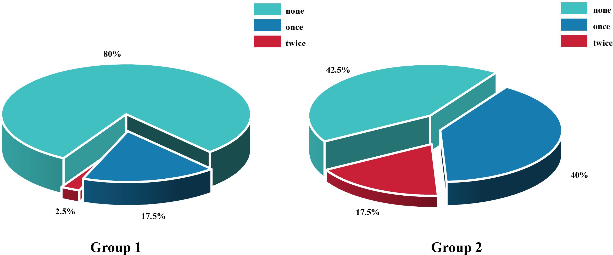 Figure 6. Comparison of the number of anti-vascular endothelial growth factor injections between Group 1 and Group 2 within 3 months postoperatively. n = 40 eyes per group.
