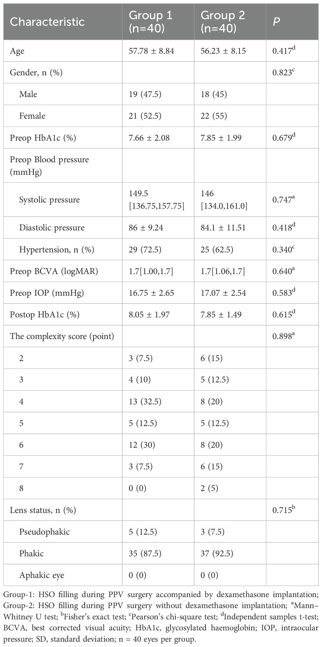 This prospective study comprised 96 eyes from 96 patients:54 eyes (54 patients) in Group 1 (PPV + HSO + dexamethasone implant,Figure 1) and 42 eyes (42 patients) in Group 2 (PPV + HSO). Ten patients were excluded from the final analysis because of failure to follow up on time, and six eyes were excluded because of dependence on silicone oil. The demographic and baseline characteristics are detailed in Table 1. No significant differences were observed between the two groups in age, sex, preoperative HbA1c levels, preoperative hypertension (P = 0.417, P = 0.823, P = 0.679, P = 0.340, respectively). The average preoperative BCVA was 1.70 [1.00, 1.70] in group 1 and 1.70 [1.06, 1.70] in group 2,P = 0.640.In group 1, the mean preoperative IOP was 16.75 ± 2.65 mmHg, while in group 2, it was 17.07 ± 2.54 mmHg, this difference was not significant (P = 0.583). Statistical analysis showed no statistically significant difference in the baseline CS scores between Group 1 and Group 2 (P = 0.898). Five patients in group 1 had IOLs, while three in group 2 had IOLs. The study included only patients who were above 40 years of age and had diabetes mellitus. The remaining 72 patients had cataracts and underwent phacoemulsification during vitrectomy. The surgical details between the two groups showed no significant difference (Table 2). The surgical duration was not significantly different between the two groups (P = 0.117). Due to the severity of their condition, 5 patients in Group 1 received perfluorocarbon liquid (PFCL) during surgery, 3 of whom underwent posterior capsulotomy and iridectomy. In Group 2, 3 patients also received PFCL during surgery, with 1 patient undergoing posterior capsulotomy and iridectomy.