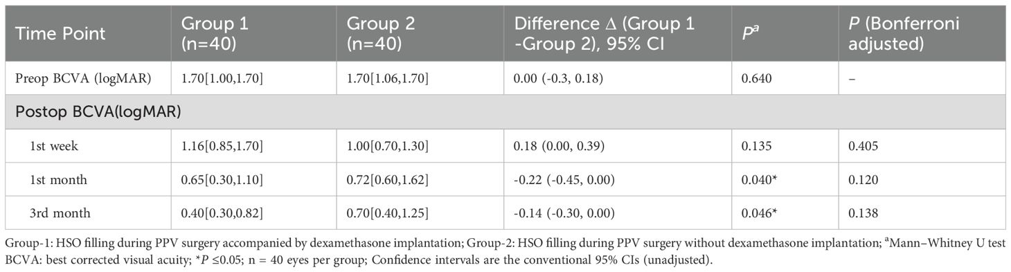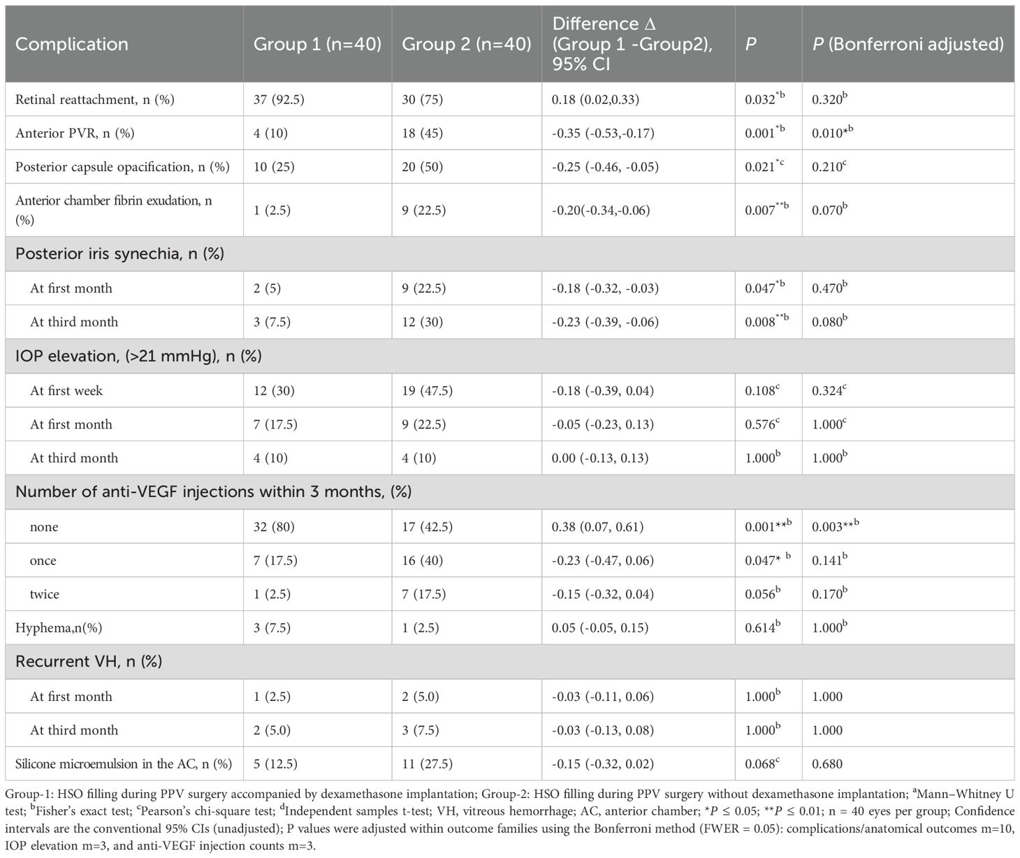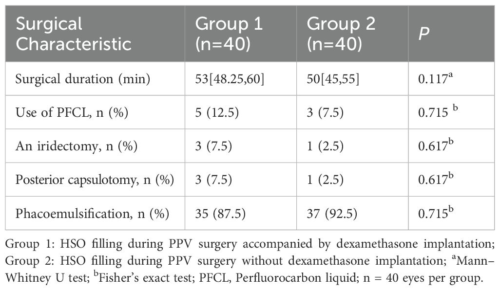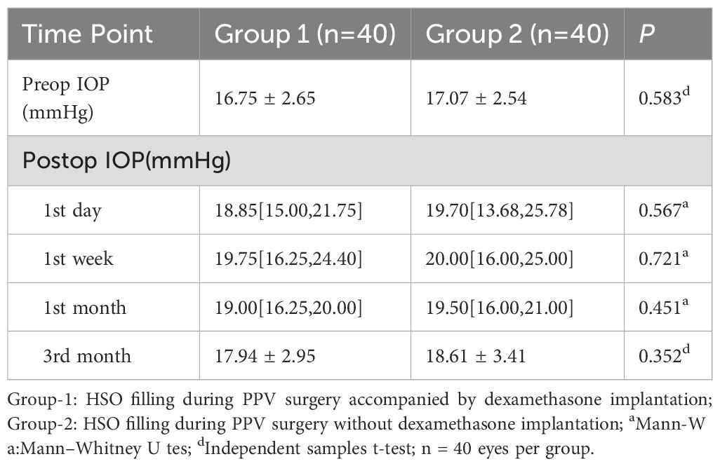 Dexamethasone implants are known to cause an increase in IOP and accelerate cataract progression. Therefore, all patients included in this study underwent phacoemulsification with vitrectomy, with postoperative IOP monitoring. The results revealed a statistically significant difference in IOP at the first week between Group 1 and the baseline level (P <0.001). Compared with the baseline IOP, Group 2 showed a marked statistical difference at different time points (P < 0.05). The IOP reached its peak at the first week in both groups, which may be attributed to the higher rate of retinectomy. The disruption of the blood–ocular barrier during surgery likely led to an increase in inflammatory factors, which are consistent with those reported by Wong D et al. (39). However, IOP did not differ significantly between two groups at the first day, first week, or months 1 or 3. Patients with IOP >21 mmHg were counted separately, and no significant differences were observed between the two groups at any of the time points. The majority of patients in this study with elevated IOP were treated with topical eye drops, and their IOP was effectively controlled. Moreover, our results show that, over time, the number of patients requiring pharmacologic therapy and AC paracentesis gradually decreased. The 3-month postoperative follow-up indicates that the dexamethasone implant appears to be safe.This result is consistent with the findings of the Ozurdex PLACID study group and a 12-month multicentre prospective clinical trial, which demonstrated that dexamethasone implants cause transient IOP increases that can be managed with medication (40, 41). Silicone oil is not only toxic to the retina but also increases the risk of postoperative complications with prolonged filling time (42). Before surgery, the doctor examines the peripheral retina and vitreous. For patients with a favourable recovery, silicone oil is generally removed after three months. The development of PCO is influenced by multiple factors, including blood glucose levels, inflammatory mediators, IOL types, and the effect of silicone oil. Considering that anterior PVR may interfere with the assessment of the posterior capsule, we believe that although a difference in the incidence of PCO was observed between the two groups in this study, it cannot be conclusively attributed to the anti-inflammatory effects of dexamethasone.