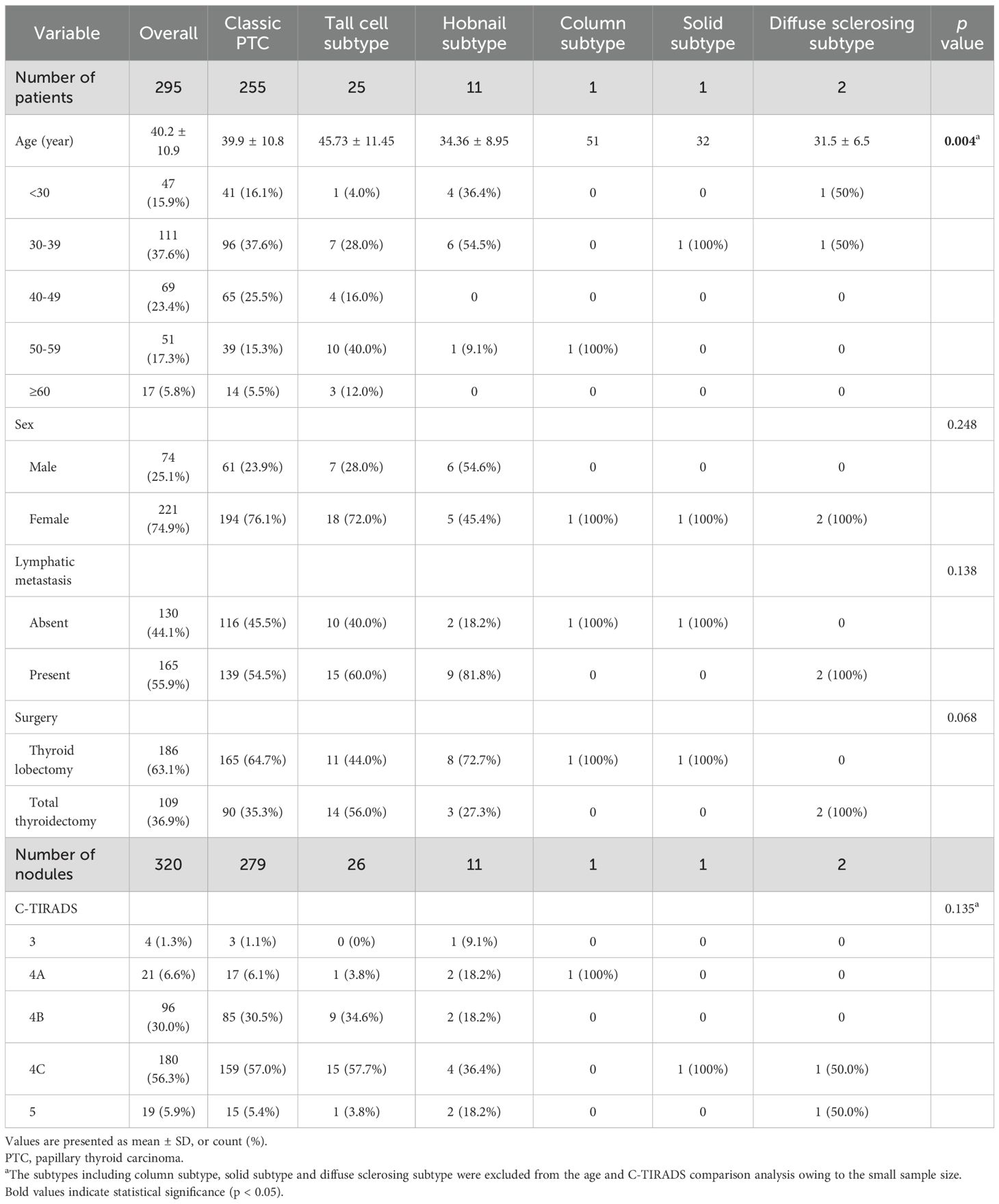 Nevertheless, knowledge of the differences in US characteristics between classic PTC and aggressive PTC subtypes is limited. The current literature predominantly focuses on greyscale US features in PTC subtypes, which have been compared to C-PTC (13–16). To our knowledge, no article has systematically compared multimodal US features between C-PTC and aggressive histologically-proven PTC subtypes based on the 2022 WHO classification of thyroid neoplasms. Therefore, this study aimed to analyze and compare multimodal US features across PTC subtypes considering the novel classification to determine whether US can aid in the differentiation of particular subtypes.