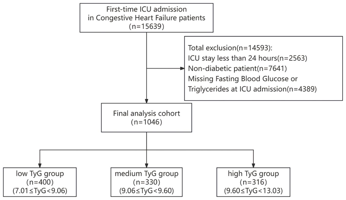 Patients admitted to the ICU with congestive heart failure were recognized via ICD-9 and ICD-10 codes and included within the research. If a patient had repeated ICU admissions, only the initial admission was chosen for analysis. The exclusion criteria for patients, as illustrated in Figure 1, are detailed henceforth: (1) ICU stays lasting fewer than 24 hours (n=2563); (2) patients without diabetes (n=7641); (3) absence of data on fasting blood glucose and triglyceride levels (n=4389).