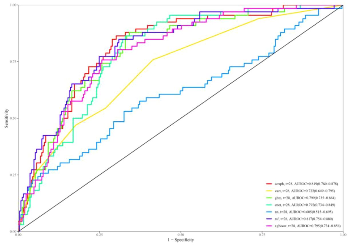 In Figure 6, the ROC curves for different models are displayed, with model performance indicated by AUC values. Coxph has an AUC of 0.819, cart has an AUC of 0.722, gbm has an AUC of 0.799, enet has an AUC of 0.792, nn has an AUC of 0.605, rsf has an AUC of 0.817, and xgboost has an AUC of 0.795. Calibration curves for each model are presented in Supplementary Figure S1.