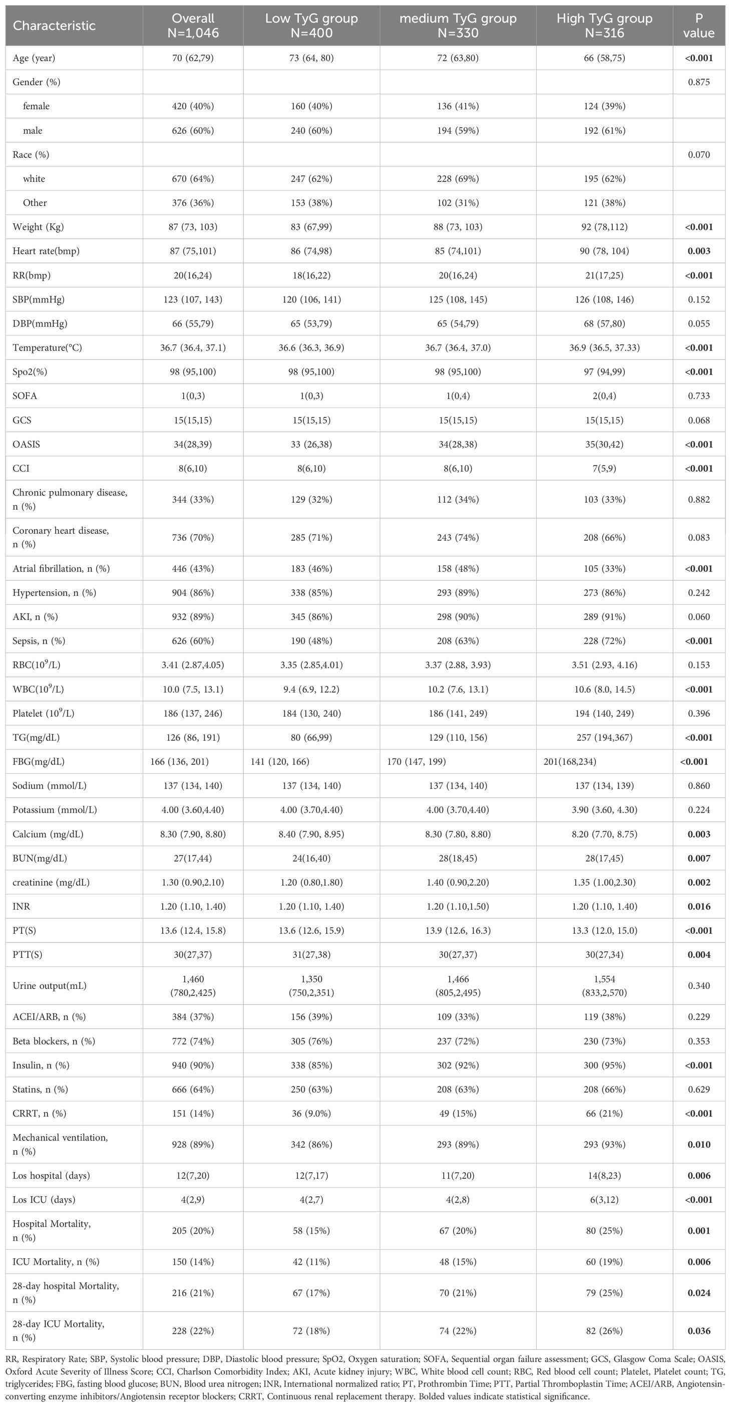 The baseline features of 1046 individuals diagnosed with CHF and DM were derived from the MIMIC-IV database (Table 1). It should be emphasized that every patient involved in this study was admitted to the ICU. The distribution of missing data for each variable is illustrated in Supplementary Figure S1. The essential features of the participants are described in Table 1. The study cohort was predominantly male (60%) and featured a high rate of comorbid conditions, including CAD(70%), hypertension (86%), AKI(89%), and sepsis (60%). By employing X-tile software, the optimal threshold for the TyG index was established, leading to the categorization of participants into three distinct groups: low TyG (7.01≤TyG<9.06, n=400), medium TyG (9.06≤TyG<9.60, n=330), and high TyG (9.60≤TyG<13.03, n=316). Individuals in the high TyG group tended to be younger, with higher weight, heart rate, RR, and temperature, but lower Spo2. Compared with other groups, they had lower OASIS and CCI scores, a decreased occurrence of AF, and a higher prevalence of sepsis. In terms of laboratory findings, they exhibited elevated WBC, TG, FBG, BUN, and serum creatinine levels, but lower blood calcium and PT, along with shorter PTT. Regarding therapeutic procedures, a higher proportion underwent CRRT, while fewer required Mechanical ventilation.