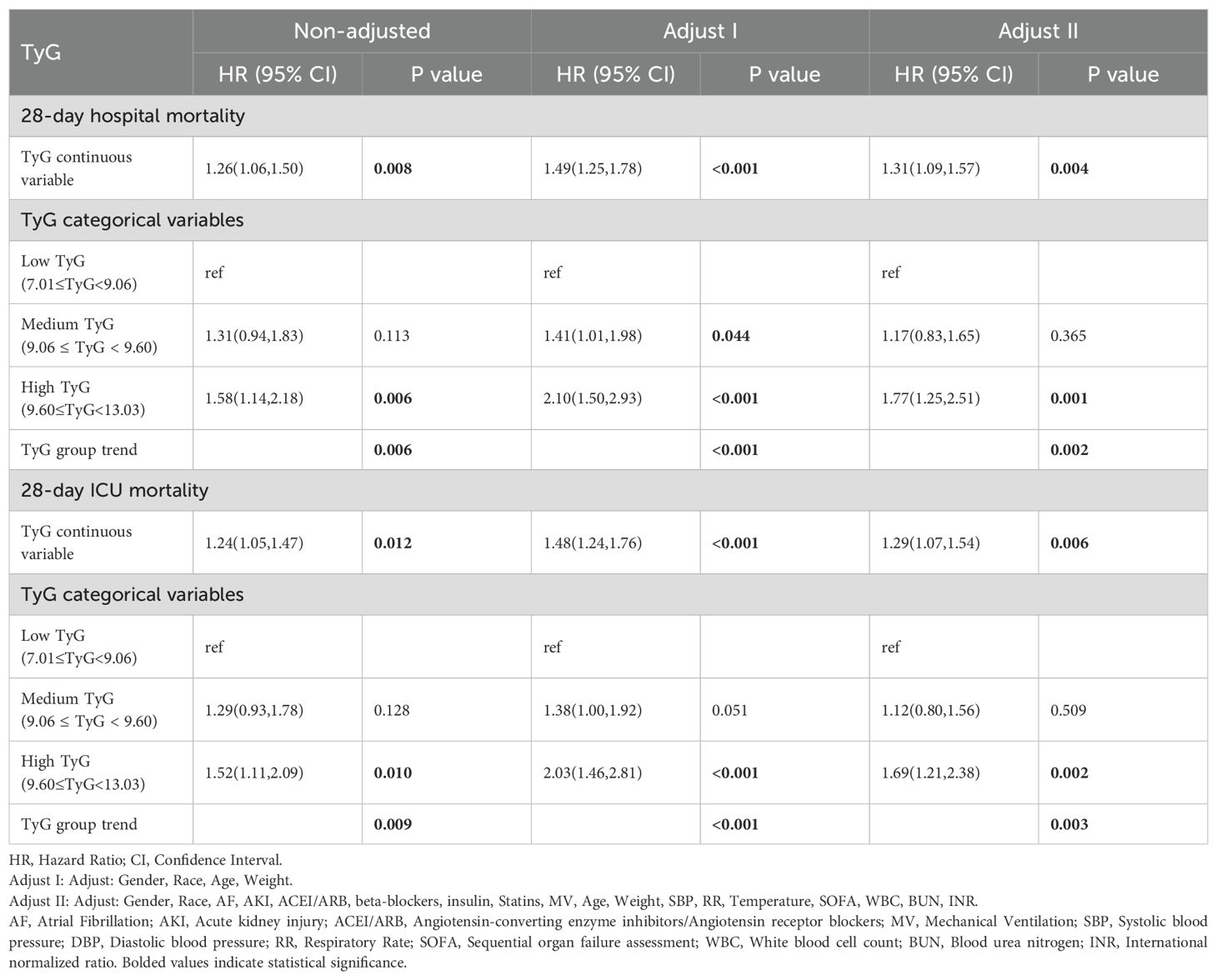This investigation revealed a robust link linking the TyG index and the likelihood for 28-day hospital mortality, which remained consistent across various models. when considered as a continuous measure, the TyG index demonstrated significant associations in the unadjusted model [HR=1.26, 95% CI: 1.06-1.50, P=0.008], Model I [HR=1.49, 95% CI: 1.25-1.78, P < 0.001], and Model II [HR=1.31, 95% CI: 1.09-1.57, P=0.004]. Similarly, the connection linking the TyG index and the likelihood of 28-day ICU mortality was consistent across different models. The adjusted model [HR=1.24, 95% CI: 1.05-1.47, P=0.012], Model I [HR=1.48, 95% CI: 1.24-1.76, P < 0.001], and Model II [HR=1.29, 95% CI: 1.07-1.54, P=0.006] (Table 2) also showed significant results (Table 2).