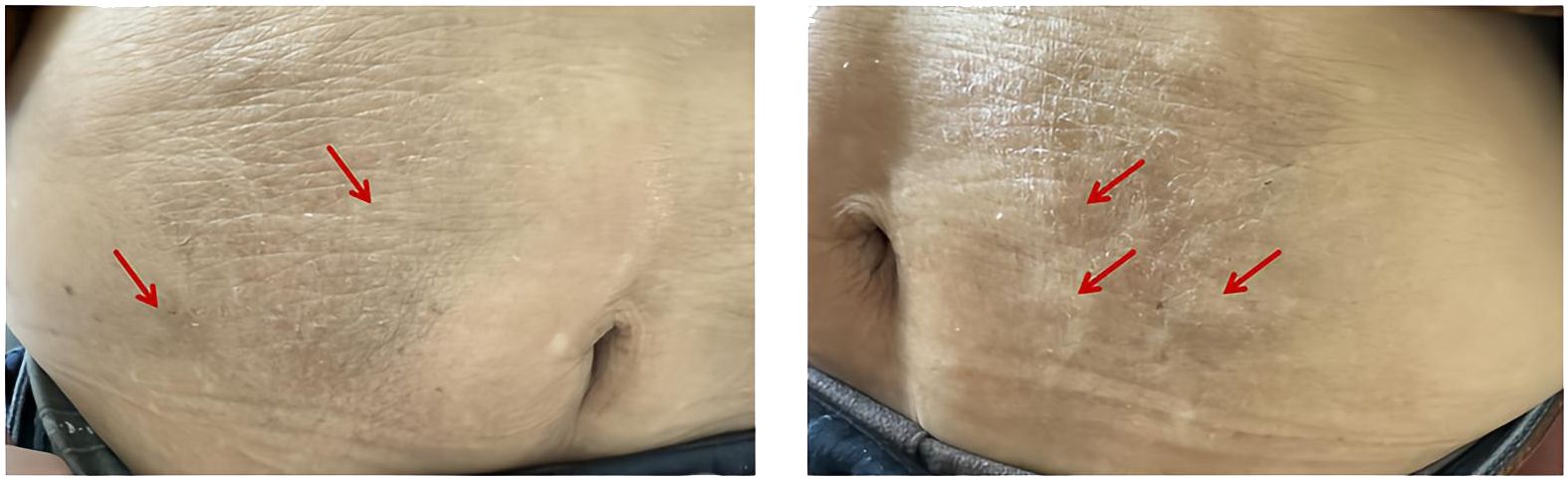 Figure 1. Numerous subcutaneous nodules surrounding the umbilical region, as indicated by red arrows.