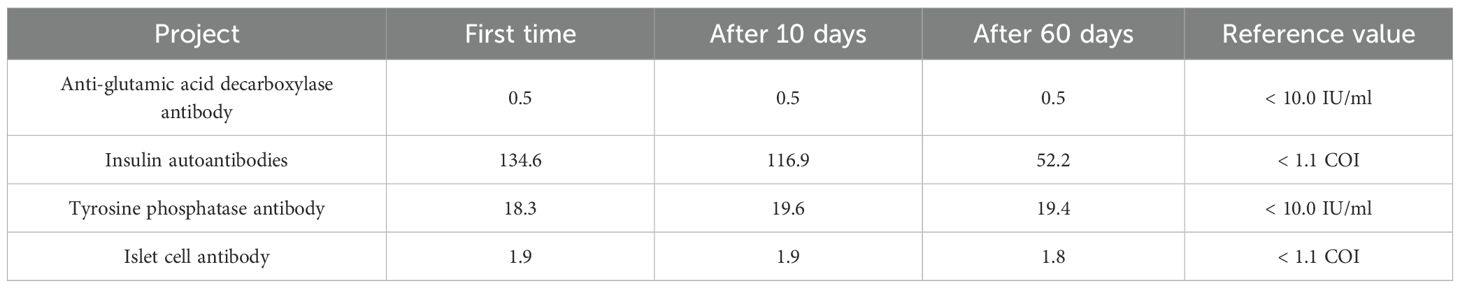 Table 3. The second patient’s autoimmune diabetes antibody profile and the blood glucose, C-peptide, and insulin secretion table.