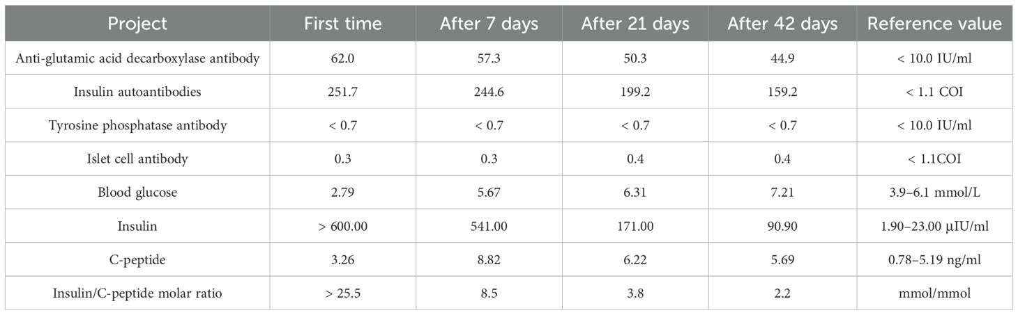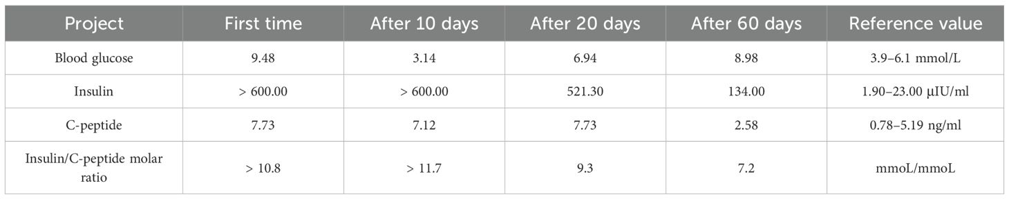 Since admission, significant fluctuations in the patient’s blood glucose levels were noted (LAGE was 26.9 mmol/L and SDBG was 7.43 mmol/L), with a sharp decline at night and persistently elevated daytime levels peaking at 29.0 mmol/L. Hypoglycemic episodes occurred between 2:00 and 6:00, with the lowest blood glucose reading being 2.7 mmol/L. Chronic renal failure and liver cirrhosis were initially considered the primary causes of glucose fluctuations, given that both conditions impair insulin metabolism and hepatic glucose output (7, 8). Consequently, the dosage of insulin aspart was increased, whereas that of insulin glargine was progressively decreased. Additionally, oral linagliptin tablets (5 mg once daily) were administered. Nevertheless, the patient still experienced fasting hypoglycemia and postprandial hyperglycemia. Thereafter, autoimmune diabetes antibody profiles were analyzed, and insulin and C-peptide levels were quantified (Table 3). The results revealed markedly high serum insulin levels and high IAA titers, along with a dissociation phenomenon between serum insulin and C-peptide. As a result, the patient was diagnosed with EIAS, and insulin was discontinued. A hypoglycemic regimen of linagliptin tablets, 5 mg orally once daily, combined with dorzagliatin, 75 mg orally twice daily, was initiated. As anticipated, overall glucose fluctuation improved. Nonetheless, episodes of hypoglycemia persisted. Linagliptin was discontinued, and oral acarbose tablets were added at a dosage of 50 mg three times daily. This adjustment stabilized glycemic control, with blood glucose levels ranging from 6 to 15 mmol/L. Serial monitoring during follow-up demonstrated a progressive decrease in serum insulin and IAA levels (Table 3).