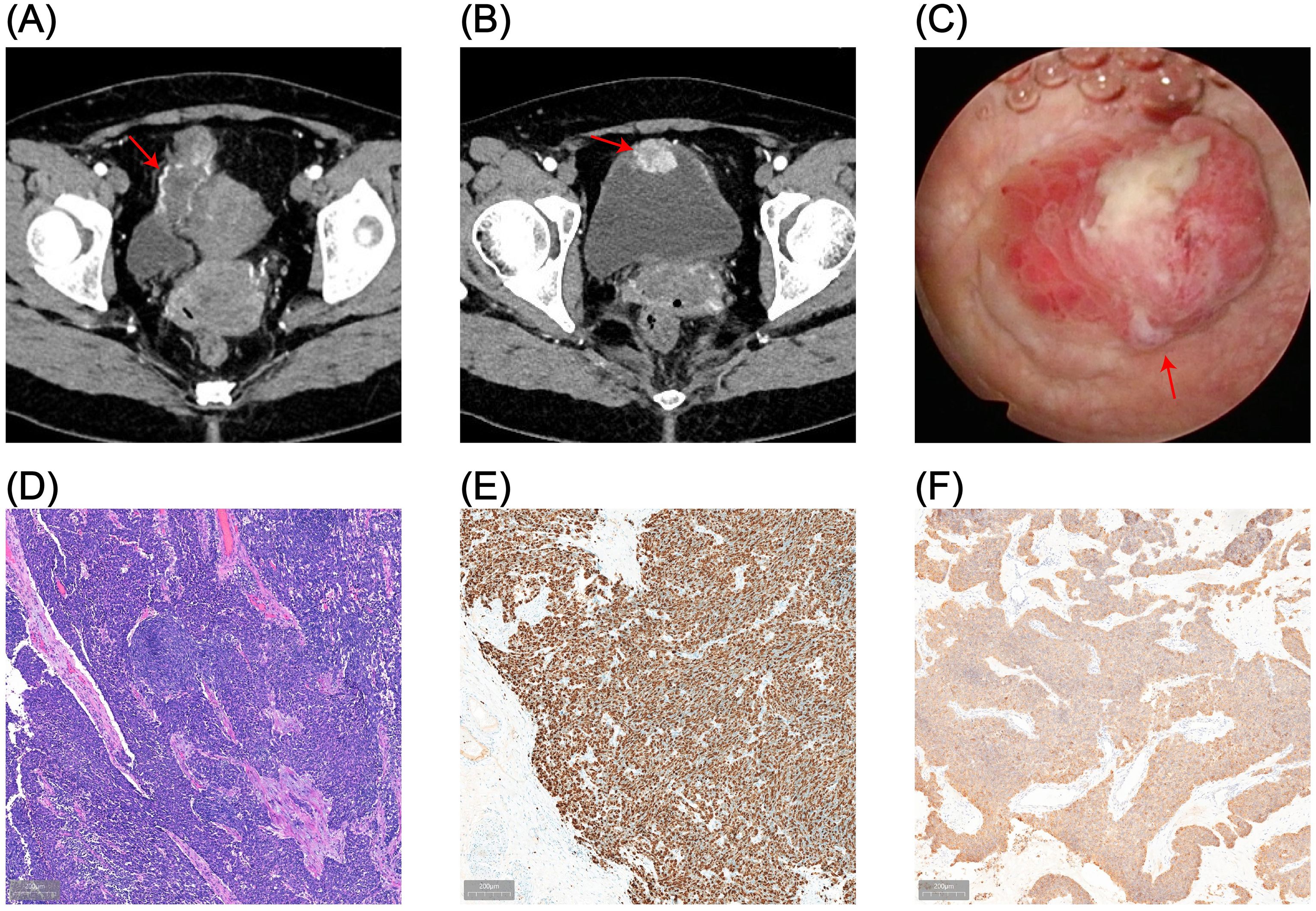 Figure 1. Preoperative imaging and pathological findings. (A, B) CTU reveals a cystic-solid mass (3.9 × 2.7 cm) located at the anterior bladder wall, demonstrating transmural invasion and marked heterogeneous enhancement. (C) Cystoscopic imaging shows full-thickness infiltration of the anterior bladder wall by the tumor. (D) Hematoxylin and eosin (HE) staining of cystoscopic biopsy confirms urachal neuroendocrine carcinoma (NEC) with small cell morphology. (E, F) Immunohistochemical staining shows a Ki-67 proliferation index of approximately 80% (E) and positive expression of synaptophysin (Syn) (F).