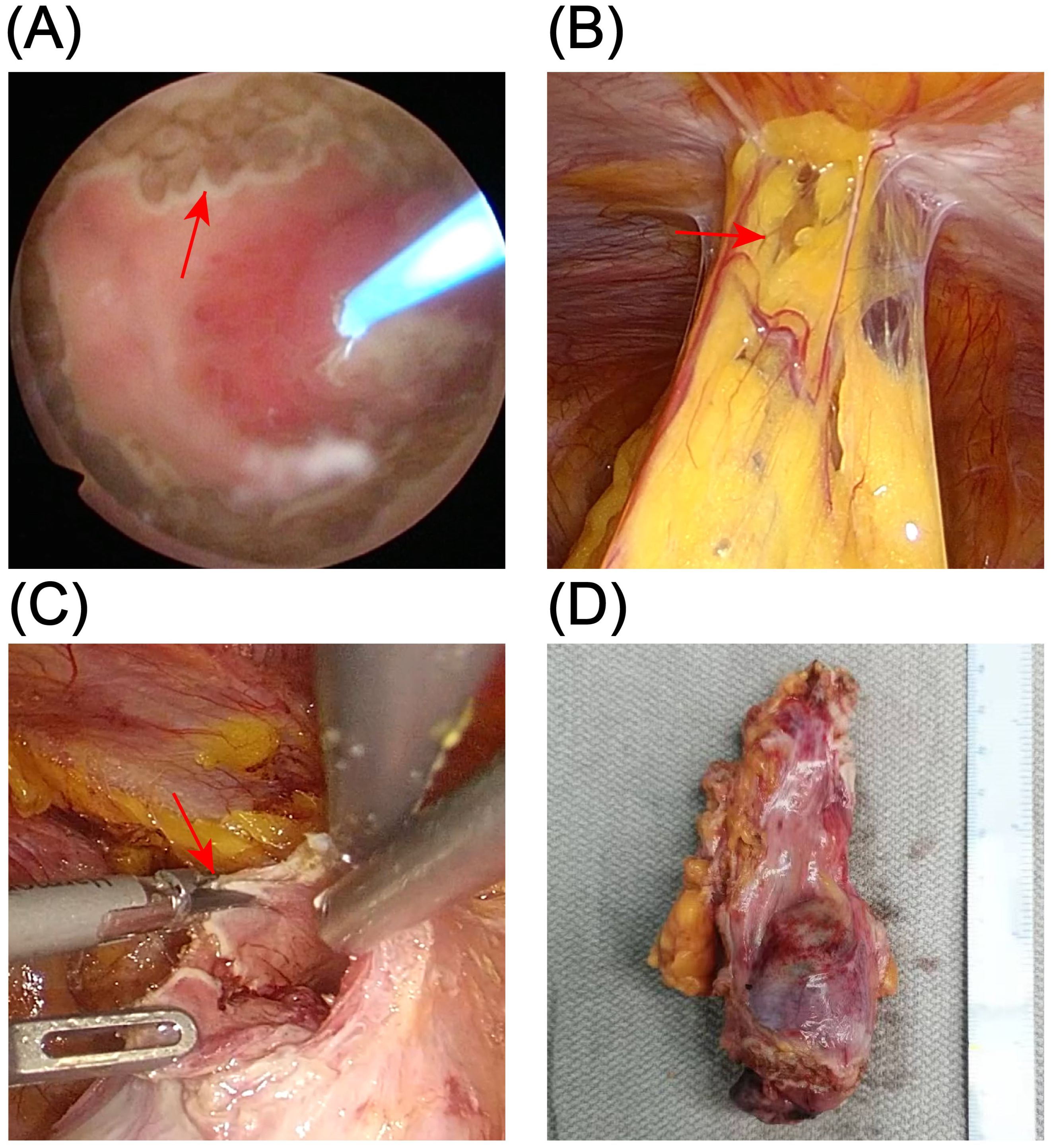 Figure 2. Surgical procedure. (A) Circumferential marking of the resection margin with a 1470-nm diode laser under cystoscopic guidance (red arrows). (B) Laparoscopic exploration showing that the urachus terminates approximately 5 cm inferior to the umbilicus, without extension to the umbilicus (red arrows). (C) Laparoscopic en bloc resection of the tumor along a plane approximately 1.5 cm beyond the laser-marked margin (red arrows). (D) Gross appearance of the resected specimen.