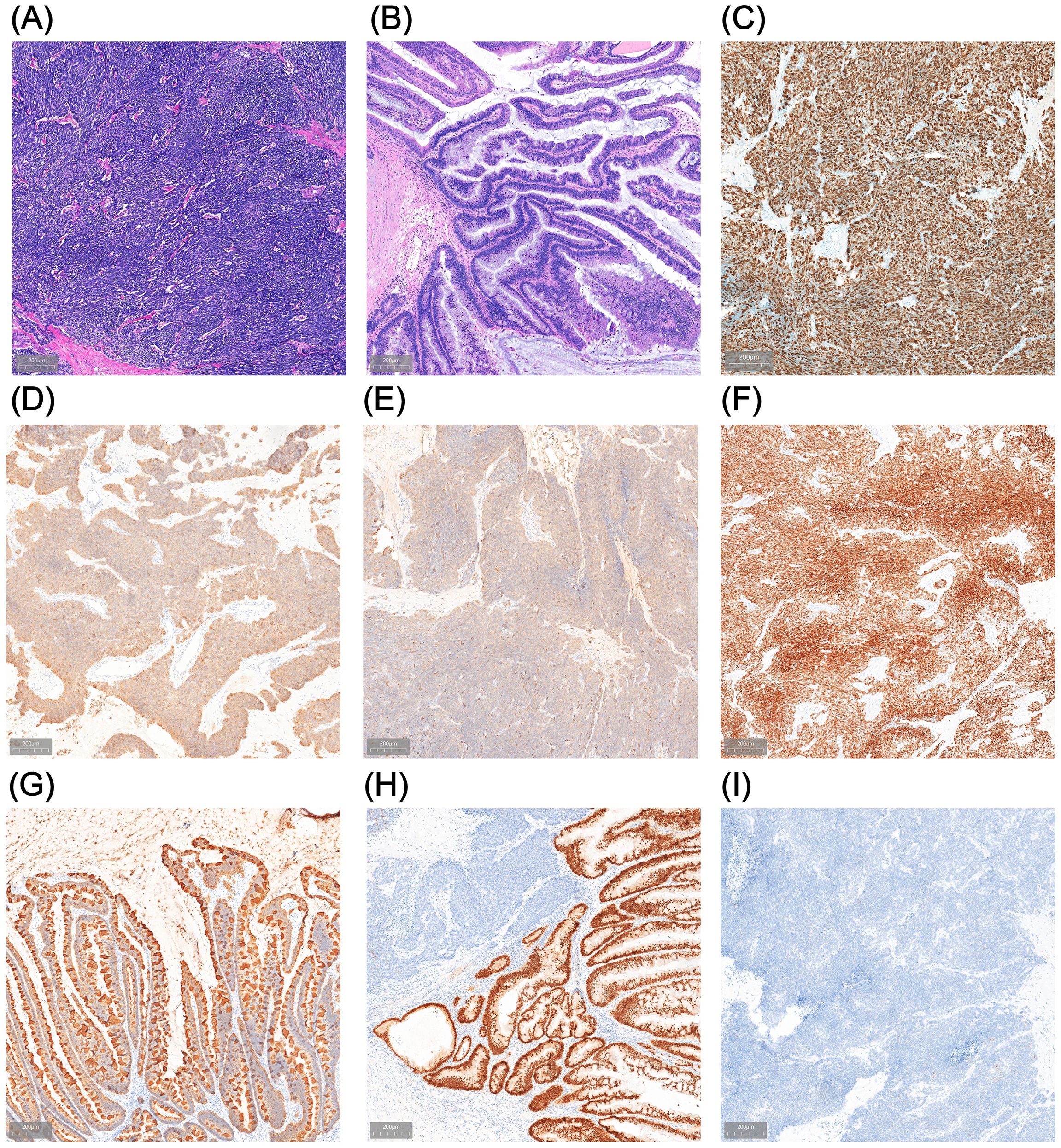 Figure 3. Postoperative pathological findings. (A, B) Hematoxylin and eosin (HE) staining of the resection specimen shows urachal neuroendocrine carcinoma (NEC) with small-cell morphology (A) admixed with an adenocarcinoma component (B). (C–I) Immunohistochemical staining demonstrates a Ki-67 proliferation index of approximately 80% (C) and positive expression of synaptophysin (Syn) (D), chromogranin A (CgA) (E), insulinoma-associated protein 1 (INSM1) (F), cytokeratin 20 (CK20) (G), and CDX2 (H), with negative GATA-3 (I).
