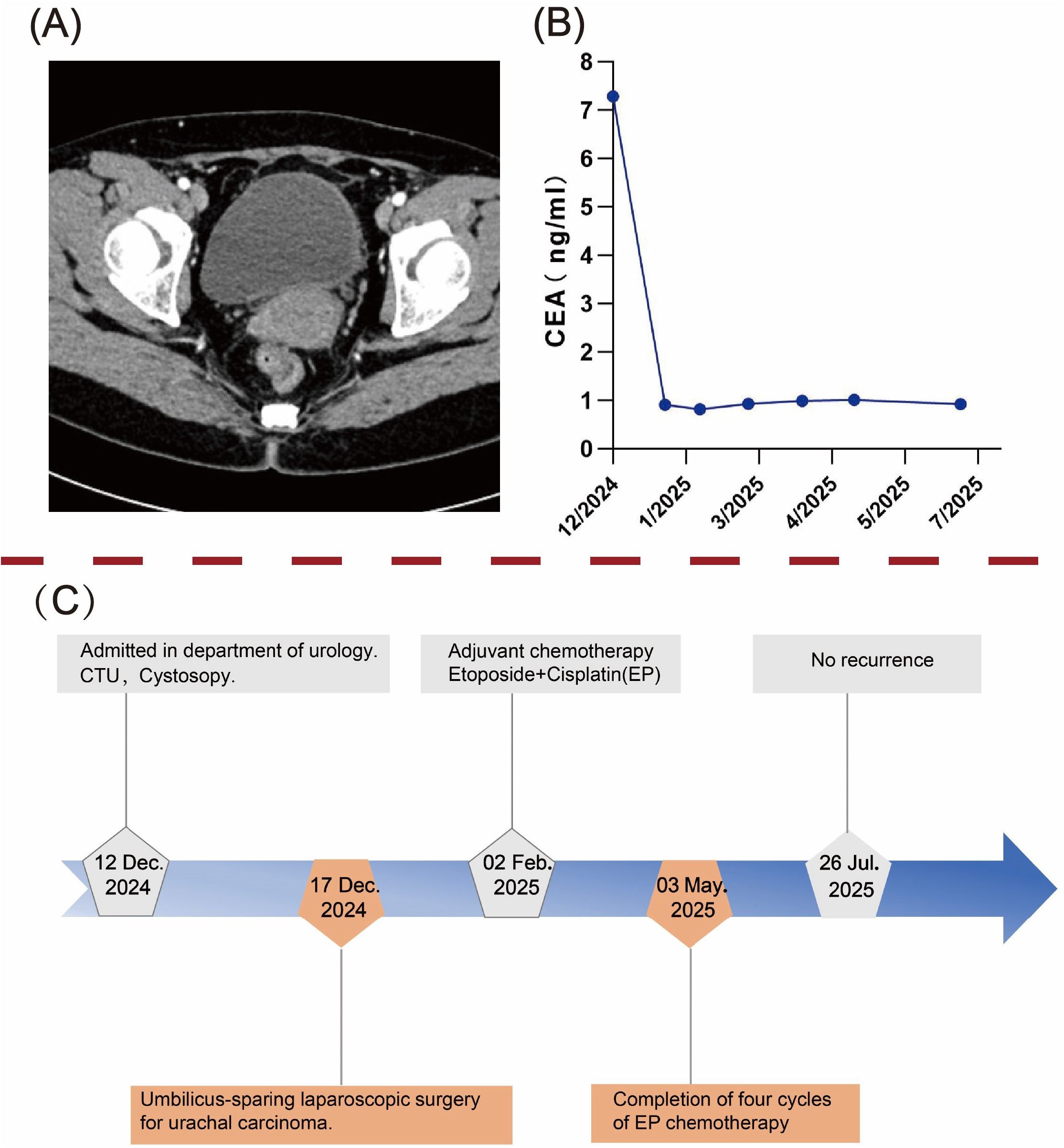 Given the high malignancy and aggressiveness of urachal neuroendocrine carcinoma (NEC) (9), the patient underwent four cycles of adjuvant chemotherapy with etoposide plus cisplatin (EP) after multidisciplinary oncological evaluation. No ≥Grade 3 treatment-related adverse events were recorded (CTCAE v5.0), and overall tolerability was good. After umbilicus-sparing extended partial cystectomy and adjuvant chemotherapy, the patient reported good overall quality of life without irritative voiding symptoms or incontinence and expressed satisfaction with the treatment. The patient underwent follow-up evaluations every three months, including tumor markers and whole-abdominal CT scans, and has remained disease-free to date. A timeline summarizing the diagnostic and therapeutic process is illustrated in Figure 4.