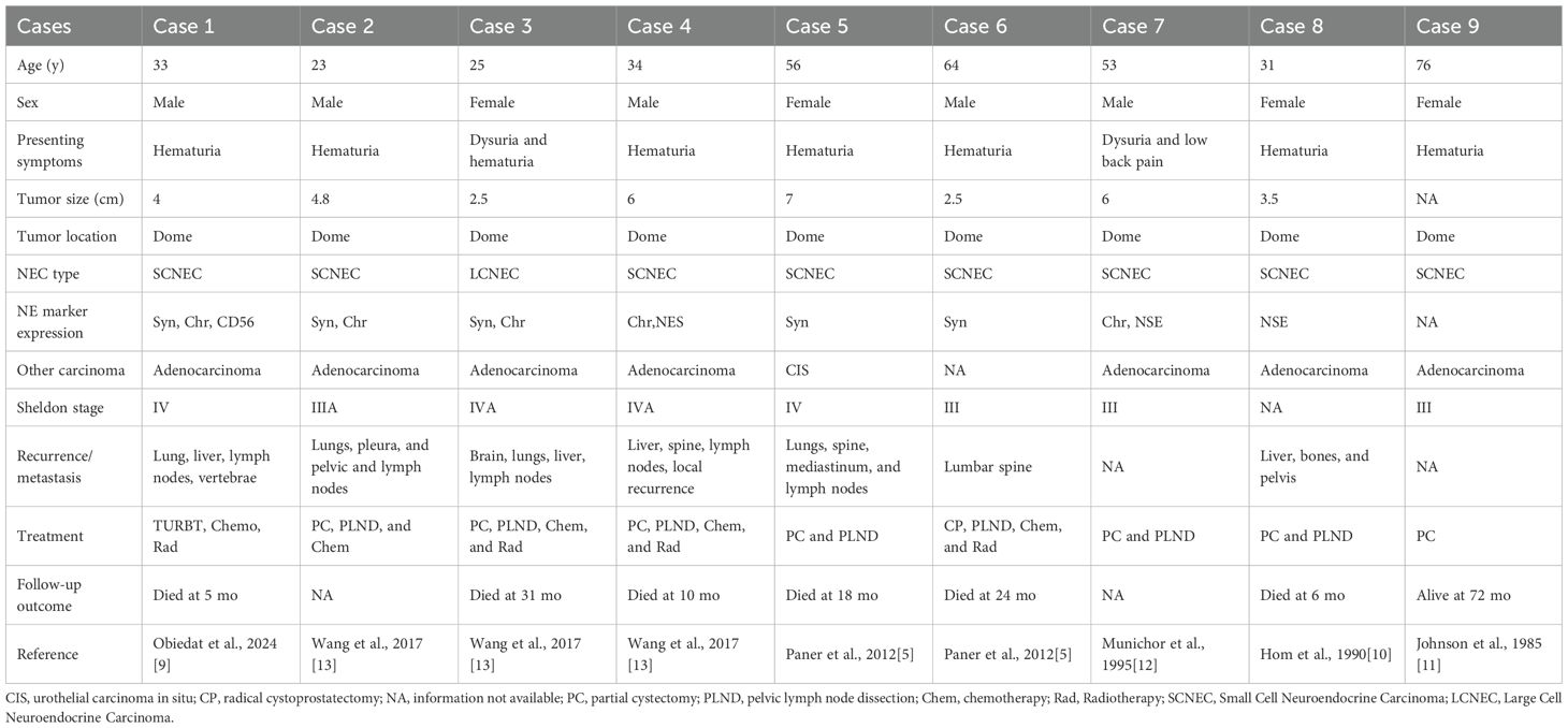 The literature search was conducted in PubMed using the keywords “urachal neuroendocrine carcinoma,” “urachal NEC,” “urachal small cell carcinoma,” and “urachal carcinoma.” Six relevant publications were identified, reporting a total of nine patients with urachal neuroendocrine carcinoma (NEC) (Table 1) (5, 9–13). Urachal NEC is an exceptionally rare and highly aggressive tumor of urachal origin, first formally described in the literature by Hom et al. in 1990. Among the nine patients, six were male and three were female; the mean age at presentation was 52.4 years, and the mean tumor diameter was 4.6 cm. Most tumors were located at the bladder dome or along the median umbilical ligament, consistent with the embryologic course of the urachus. Gross hematuria was the most common presenting symptom (8/9), with a minority reporting dysuria, flank pain, or infection. Histologically, seven of the nine cases were mixed tumors comprising NEC with an adenocarcinoma component, including six small-cell NECs (SCNEC) and one large-cell NEC (LCNEC); one case was NEC with a urothelial carcinoma component, and the remaining case was pure small-cell NEC. In the six patients with SCNEC combined with adenocarcinoma, the NEC component was predominantly positive for Chromogranin A (CgA), Synaptophysin (Syn), and INSM1. Regarding management, all nine patients underwent initial local therapy: seven received partial cystectomy, one underwent radical cystectomy, and one was treated with transurethral resection of bladder tumor (TURBT). For adjuvant therapy, five patients received platinum-based chemotherapy, and four of these also underwent postoperative radiotherapy. Despite multimodal treatment in some cases—including definitive surgery combined with adjuvant chemoradiation—long-term survival remained suboptimal. Of the eight cases with available follow-up, seven developed distant metastases, most commonly to the lungs, liver, and lymph nodes, and the majority of patients died within 12–24 months of diagnosis, underscoring the highly malignant nature and early metastatic propensity of this disease.